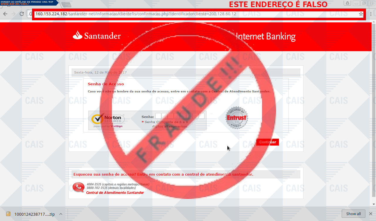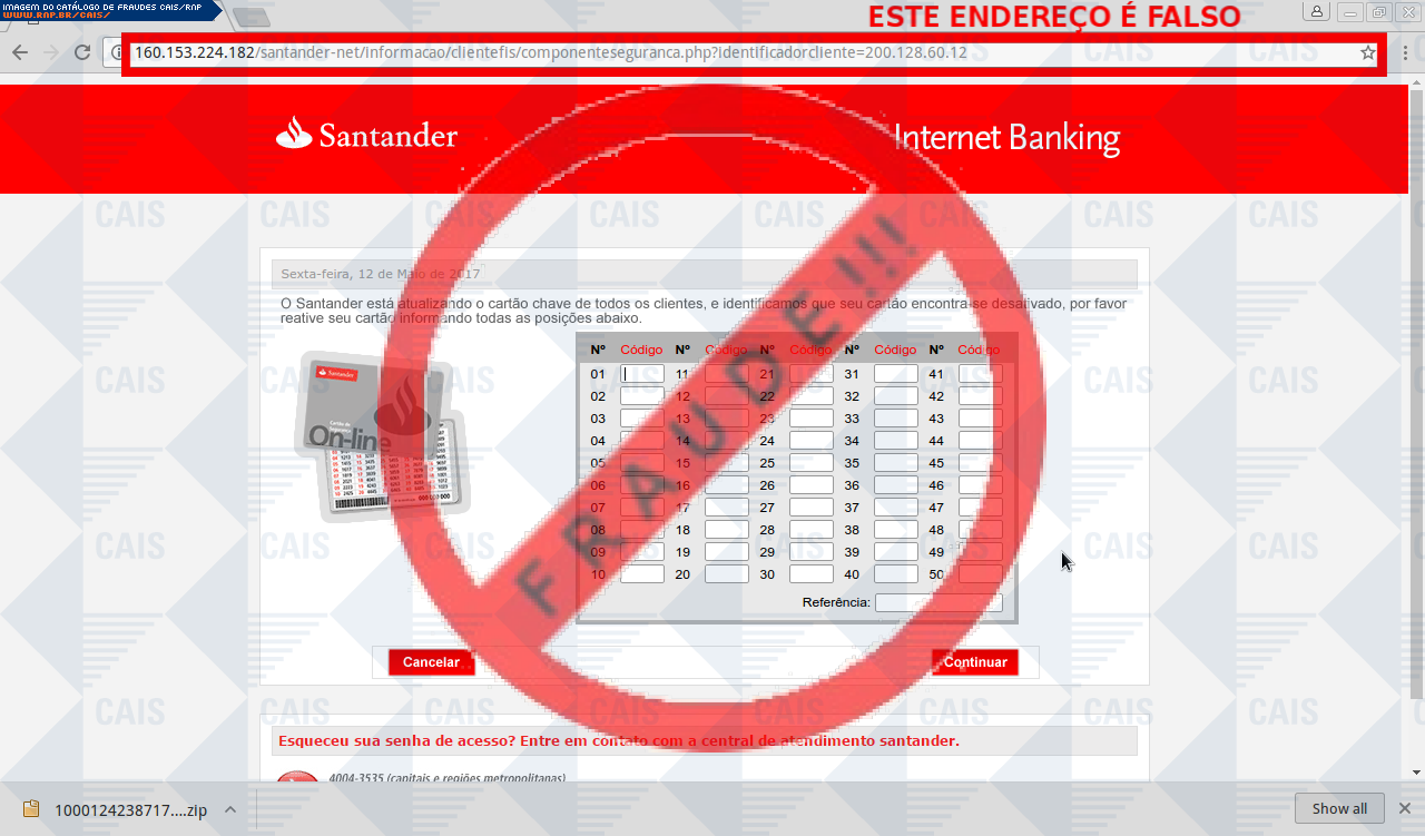 | comentário | O usuário recebe uma mensagem informando que o sistema do Banco Santander atualizou sendo necessário realizar uma atualização também na sua conta, no entanto a página é falsa destinada a roubar as informações bancárias do usuário. | |