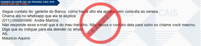 | comentário | A vítima recebe um e-mail contendo um número de telefone para manter contato com gerente do Banco para saber informações, porém o contanto é falso destinado a roubar informações da vítima. | |