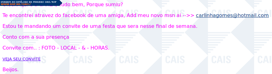 | comentário | Suposto convite para festa leva ao download de um malware, identificado como: Gen:Variant.Zusy.676 (Bit Defender). | |