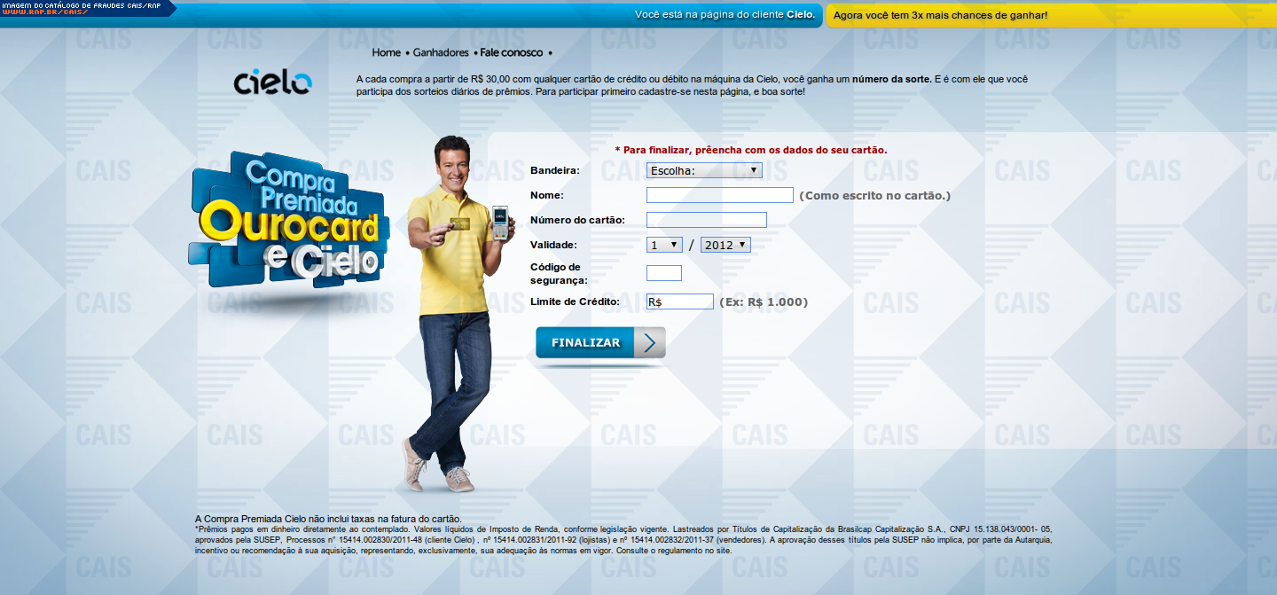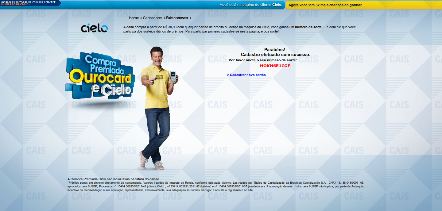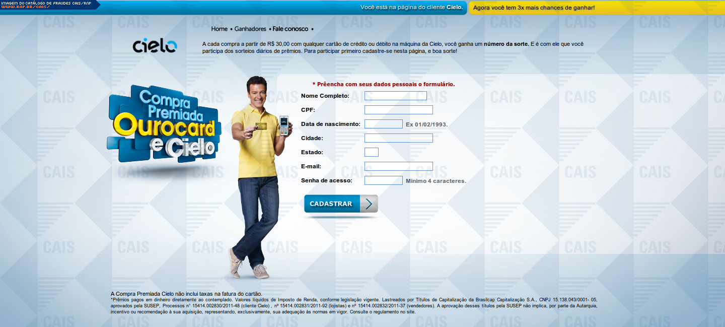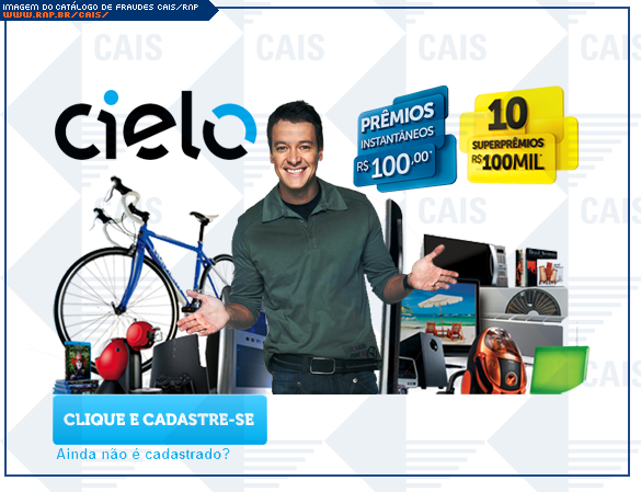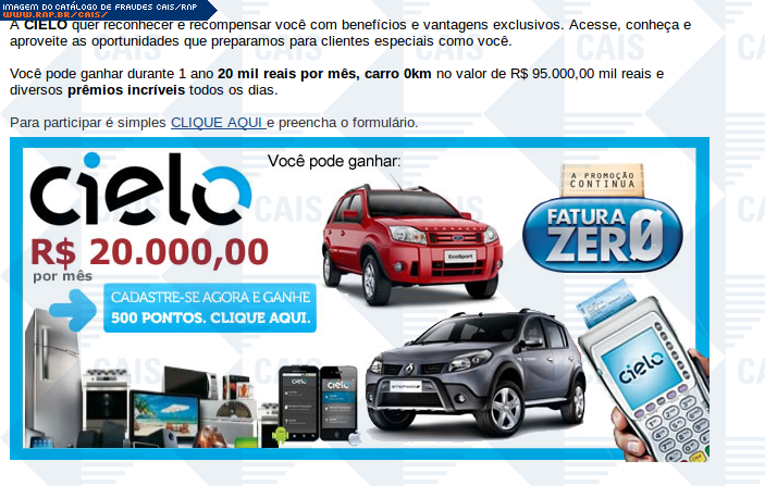 | comentário | A fraude contém um link para o cadastro na promoção "Compra premiada" da Cielo. O link leva a um site falso, destinado a coletar dados da conta bancária da vítima. | |
