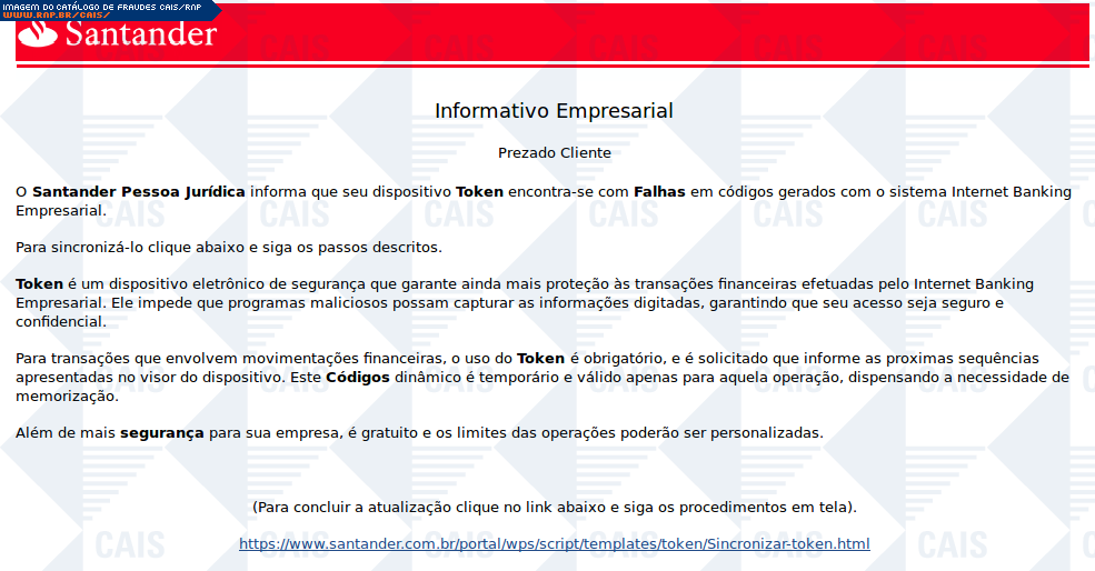 | comentário | Falsa mensagem em nome do Santander, comunica falhas no aparelho token. Há um link para realização de suposta atualização, porém este leva ao download de um malware, identificado como: Win32.Parite.B(bit Defender). | |