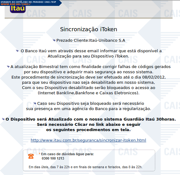 | comentário | Falsa mensagem em nome do itaú solicita atualização em dospositivo iToken. O link disponível para tal atualização, contudo, não apontava para um endereço válido. | |