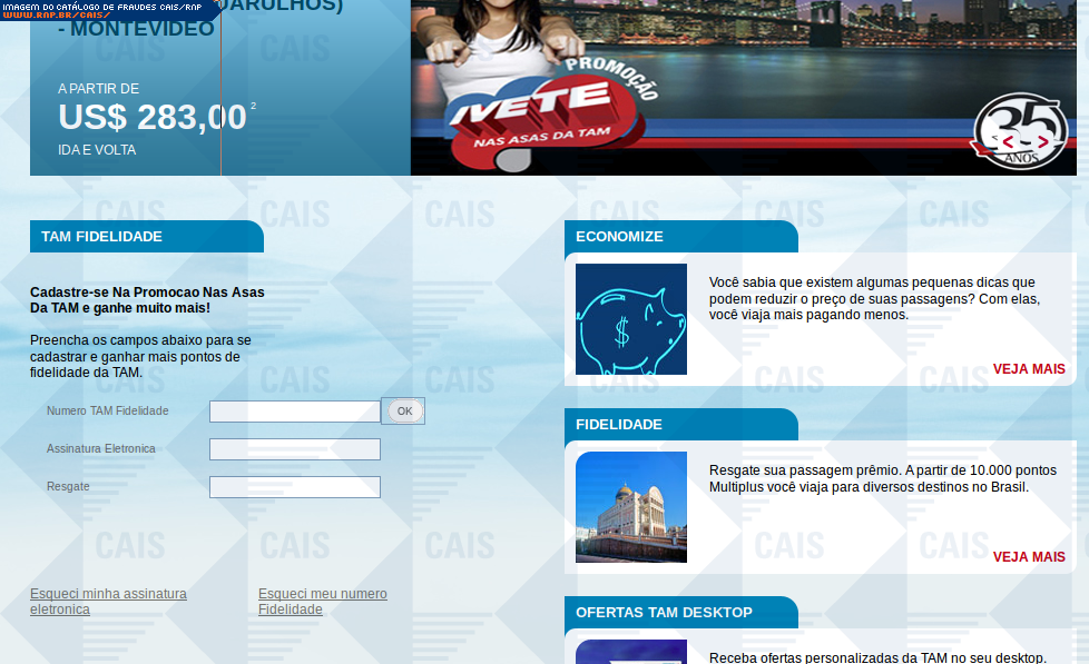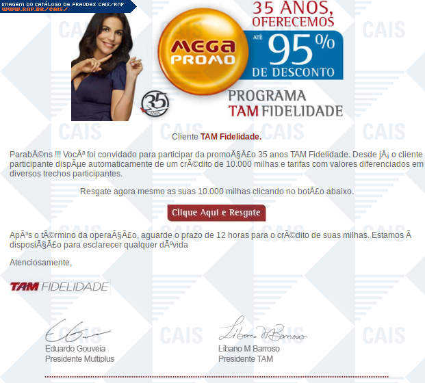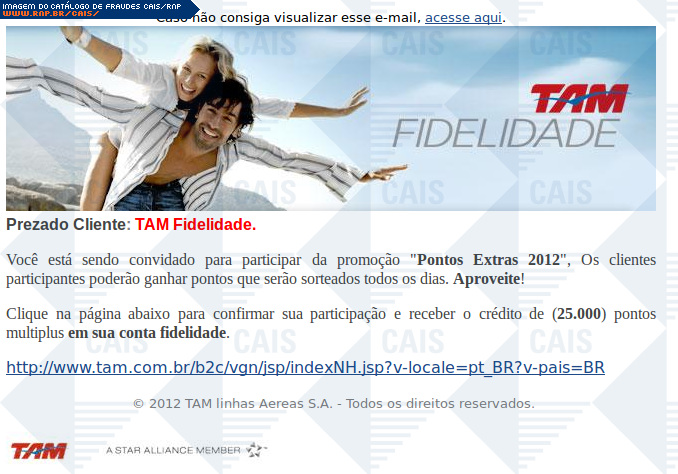 | comentário | A fraude trata-se de um falso convite para participação em promoção da Tam. Oferece ainda 10.000 pontos para resgate imediato. Contudo, o link para tal resgate leva à uma falsa página da Tam na qual dados sigilosos são solicitados. | |