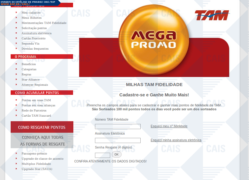 | comentário | Falso convite para participação em promoção da Tam. O link destinado ao cadastro leva à uma falsa página da Tam, na qual dados confidenciais são solicitados. | |