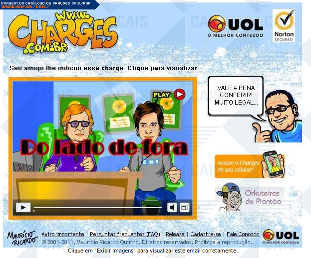 | comentário | A fraude trata-se de um falso comunicado de que a vítima recebeu uma charge de um amigo. Contudo, o link para visualização de tal charge, leva ao download de um malware, identificado como: Gen:Trojan.Heur.VP.ku0baGrfwkei (Bit Defender). | |