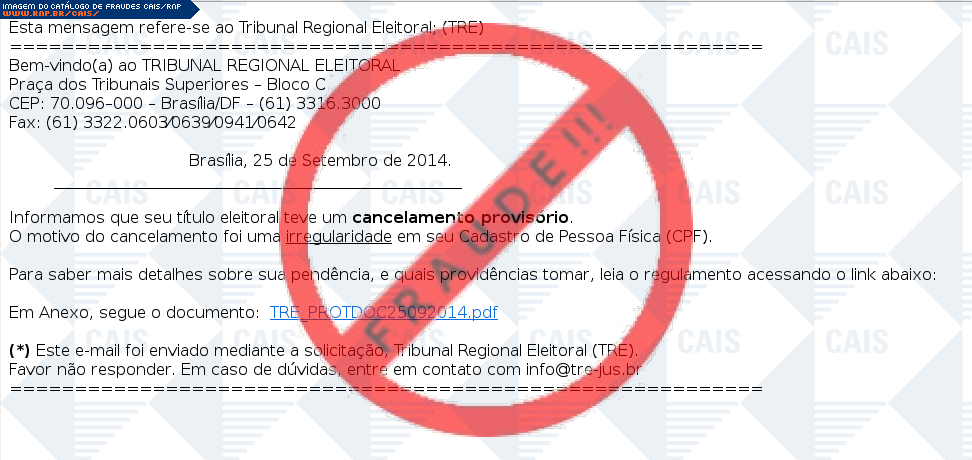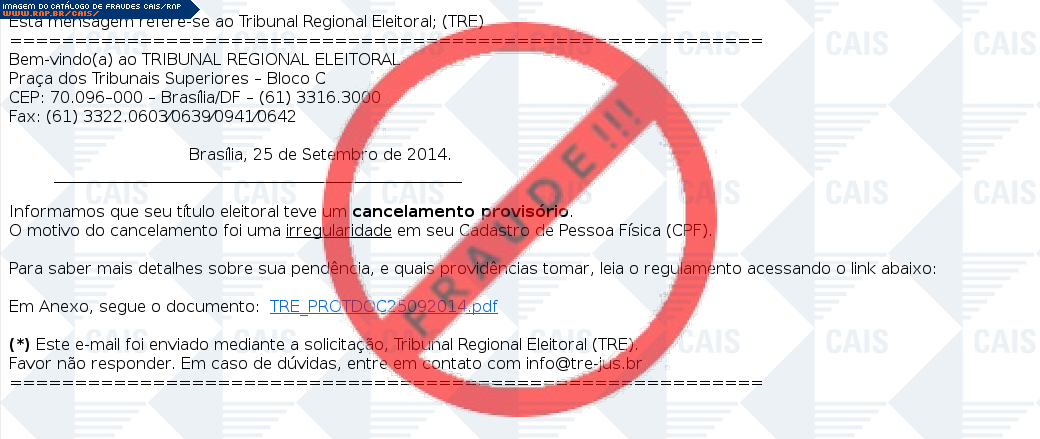 | comentário | A vítima recebe uma mensagem informando que seu título foi cancelado temporariamente estando um documento com maiores informações disponível para download, entretanto o arquivo originado é malicioso destinado a roubar as informações do usuário e instalar... (leia mais) | |