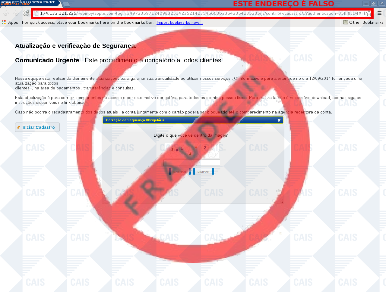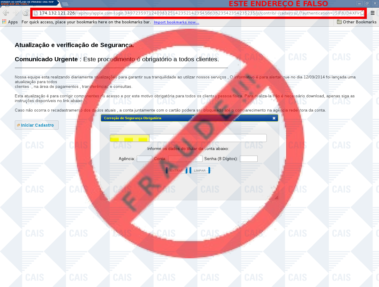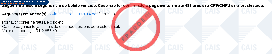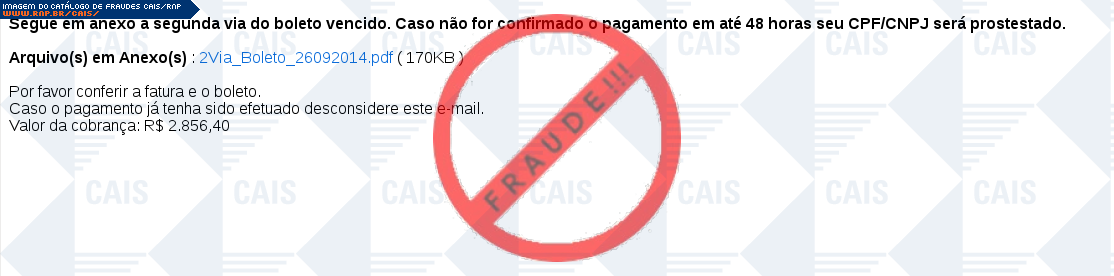 Esta página tem função informativa e educativa. Exibe uma coleção de imagens de phishing scam (fraudes eletrônicas) ou malware (código malicioso) veiculados por meio de spam (e-mail não-solicitado). Trata-se de conteúdo exemplificativo, não exaustivo, uma vez que não é possível contemplar todos os casos de fraudes existentes. Assim, caso você tenha conhecimento de um exemplar que não esteja aqui presente, isto não significa que não seja válido ou real. Inclusive incentivamos que você o envie para análise do CAIS para que, se for o caso, passe a integrar o nosso acervo.