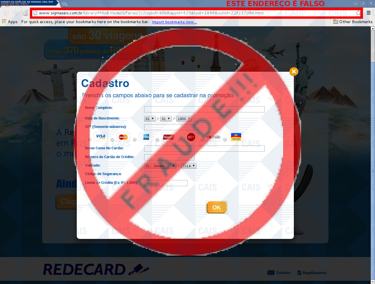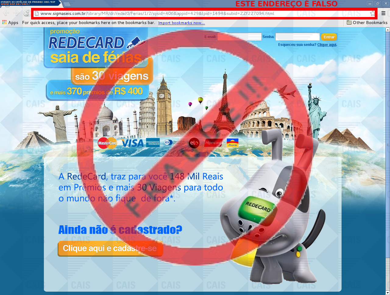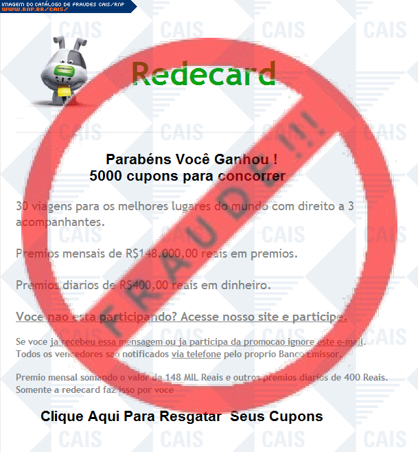 | comentário | A vítima recebe um e-mail informando sobre promoções e descontos relacionados a seu cartão da REDECARD sendo necessário realizar um cadastro, no entanto a página é falsa destinada a roubar os dados do cartão de crédito do usuário. | |