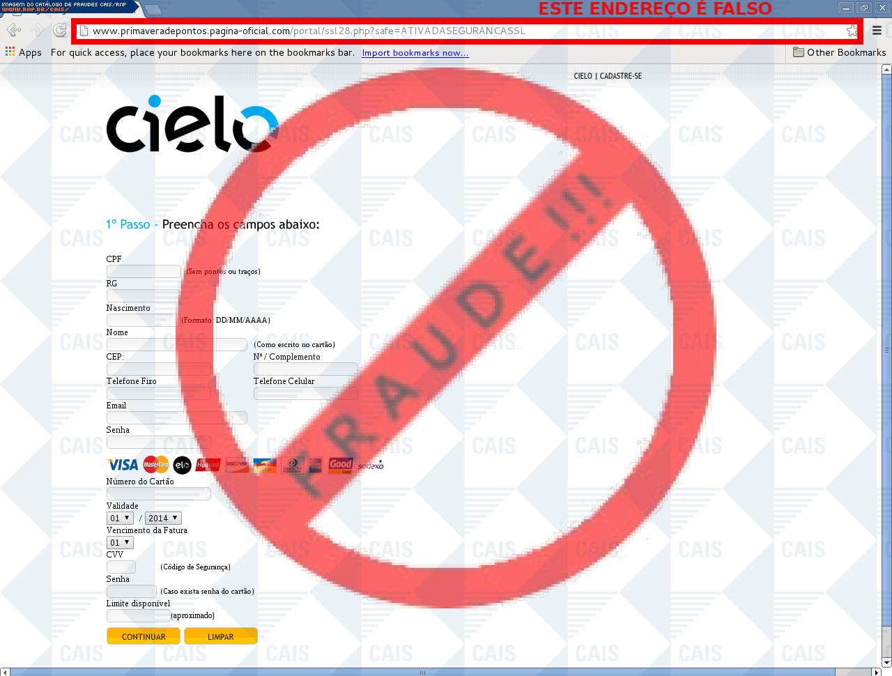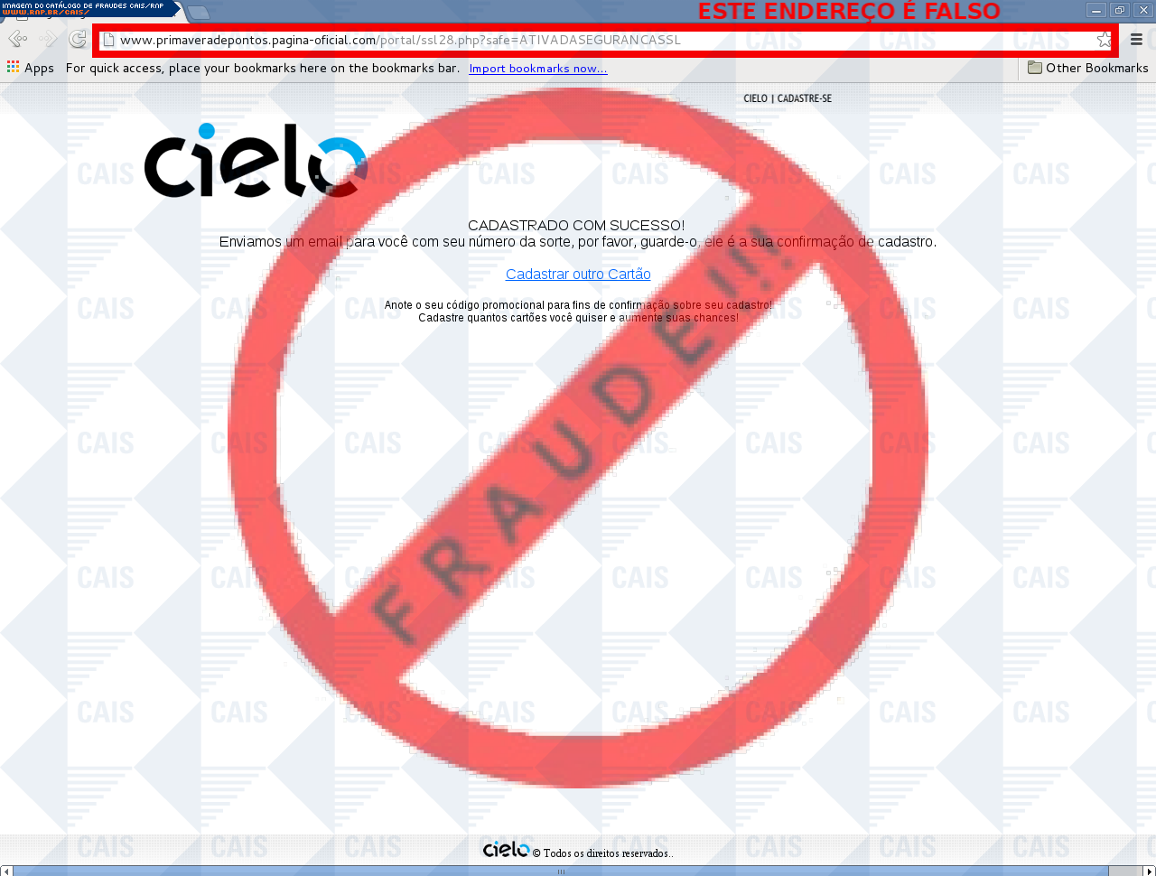| comentário | A vítima recebe um e-mail informando sobre promoções e descontos relacionados a seu cartão Cielo sendo necessário realizar um cadastro, no entanto a página é falsa destinada a roubar os dados do cartão de crédito do usuário. | |