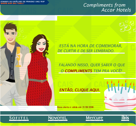 | comentário | Mensagem que se passa por um cartão de aniversário da Accor Hotels. Ao clicar sobre o link o usuário seria levado a um suposto presente de aniversário. O software malicioso foi identificado como downloader pela Symantec. | |