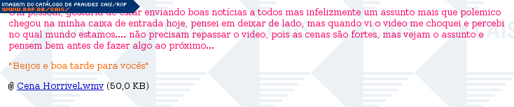 | comentário | Mais uma vez o usuário é abordado com mensagens que abordam temas polêmicos. Esta mensagem traz o link para um suposto vídeo com uma "cena horrível", que chocou a pessoa que encaminhou a mensagem e que naturalmente deixa a maioria dos usuários curiosos. O... (leia mais) | |