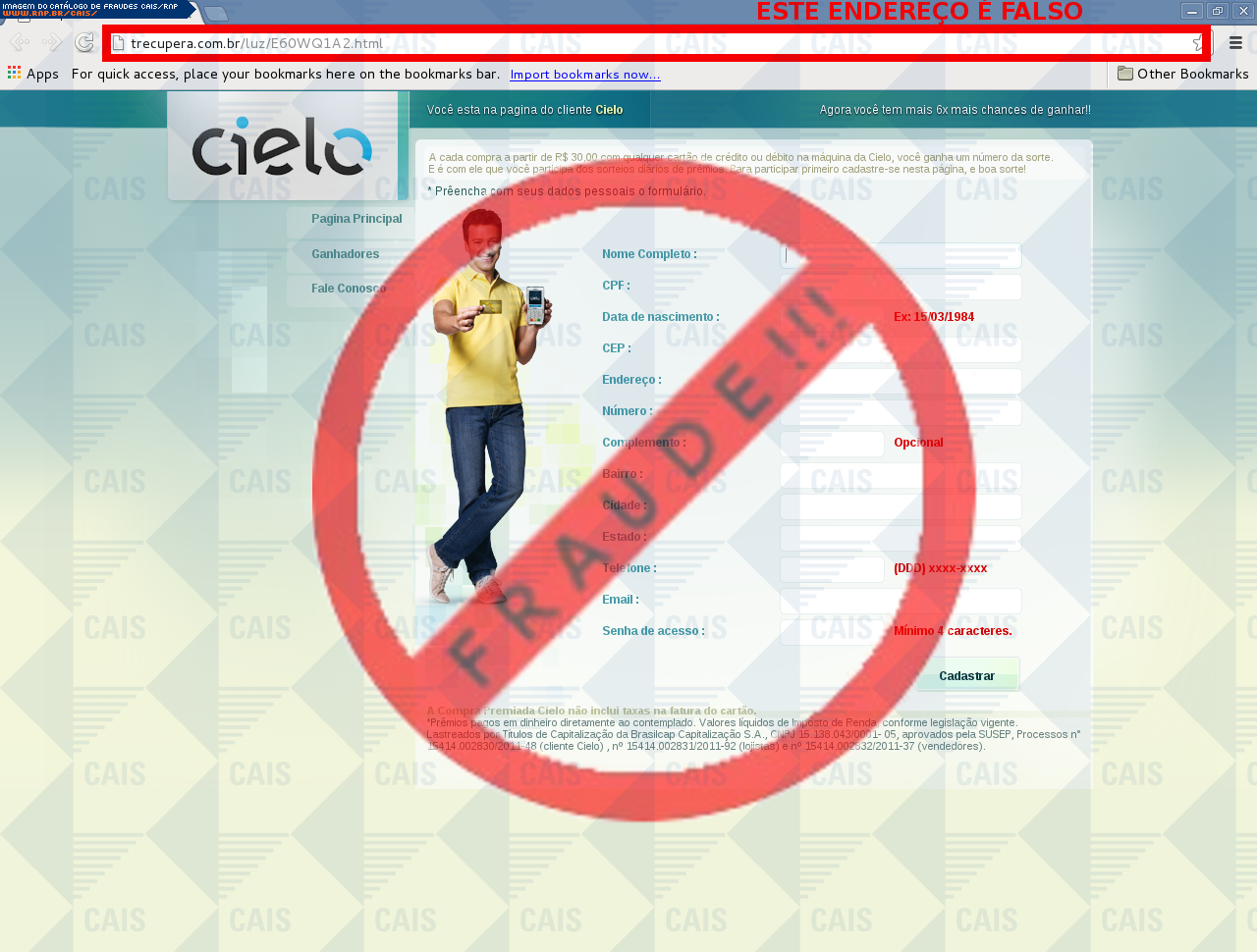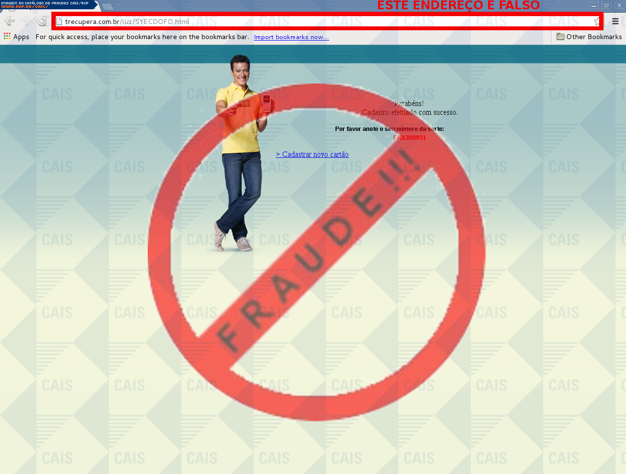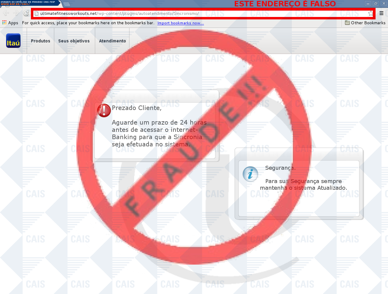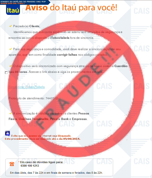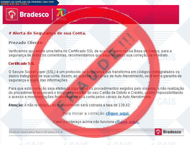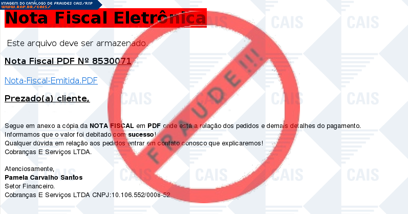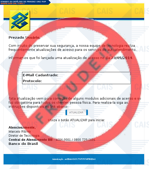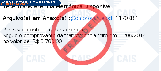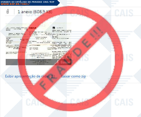Esta página tem função informativa e educativa. Exibe uma coleção de imagens de phishing scam (fraudes eletrônicas) ou malware (código malicioso) veiculados por meio de spam (e-mail não-solicitado). Trata-se de conteúdo exemplificativo, não exaustivo, uma vez que não é possível contemplar todos os casos de fraudes existentes. Assim, caso você tenha conhecimento de um exemplar que não esteja aqui presente, isto não significa que não seja válido ou real. Inclusive incentivamos que você o envie para análise do CAIS para que, se for o caso, passe a integrar o nosso acervo.