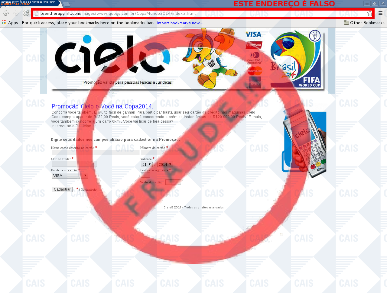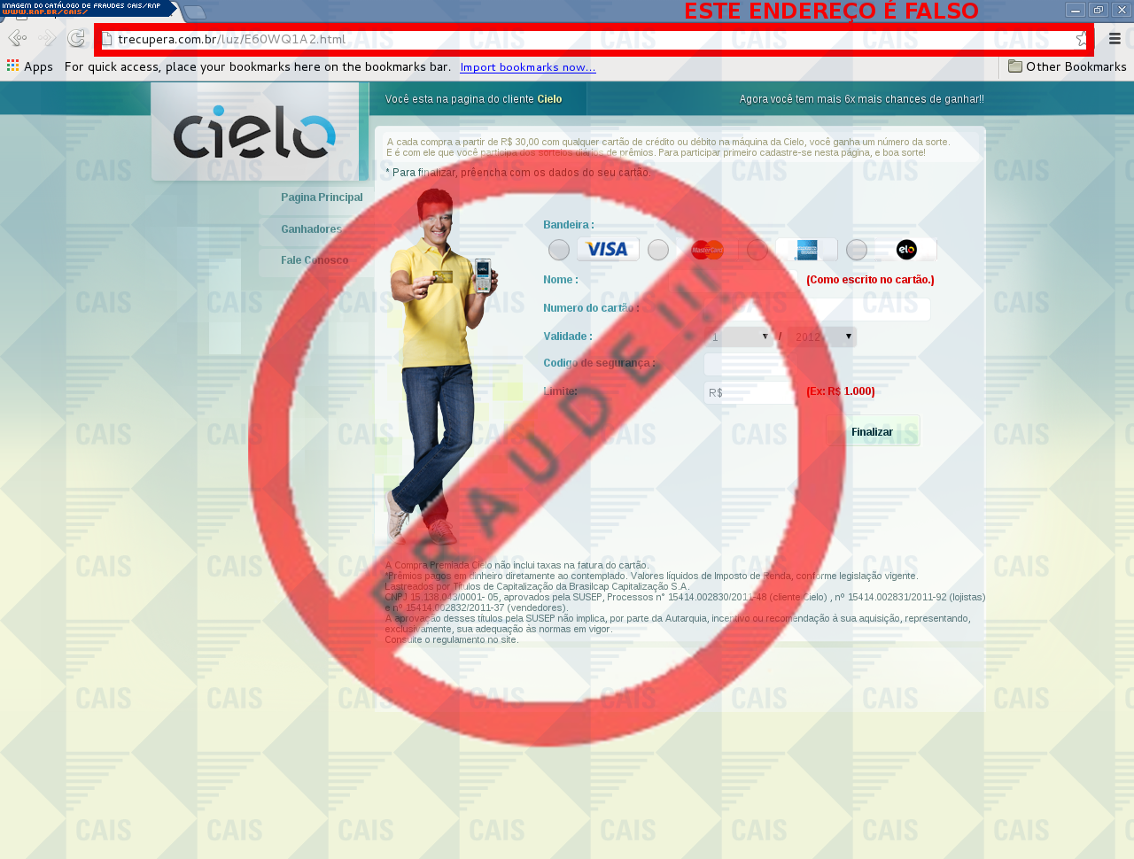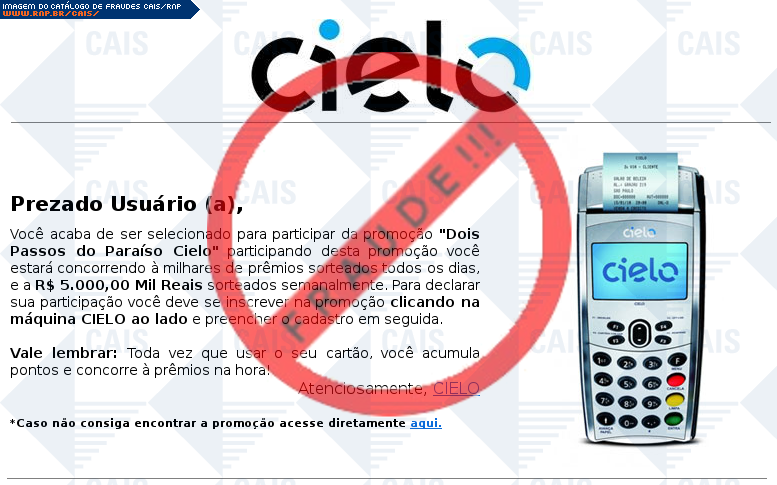 | comentário | A vítima recebe uma mensagem falando sobre promoções referente ao cartão da Cielo, porém a página maliciosa é destinada a roubar as informações bancárias do usuário. | |