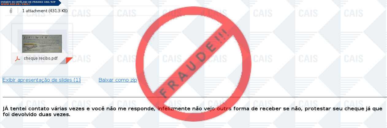 | comentário | A vítima recebe uma mensagem contendo a imagem de um cheque como arquivo para download, sendo este cheque em seu nome que foi devolvido duas vezes, porém o arquivo é falso com objetivo de extrair dados confidencias do usuário, com o nome de Trojan.GenericKD.1705876.... (leia mais) | |