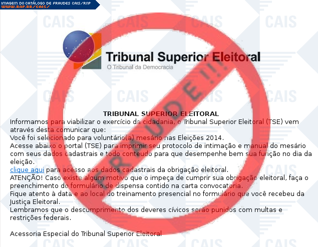 | comentário | O usuário recebe uma mensagem informando que foi convocado a participar das eleições de 2014 como voluntário e que a não participação acarretaria em punições com multas e restrições, no entanto o link disponível realiza o download de um arquivo falso destinado... (leia mais) | |