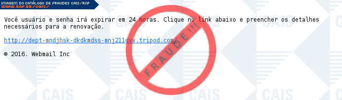 | comentário | A vítima recebe uma mensagem informando sobre manutenção no serviço de email, sendo necessário realizar login em formulário falso no link disponibilizado. | |