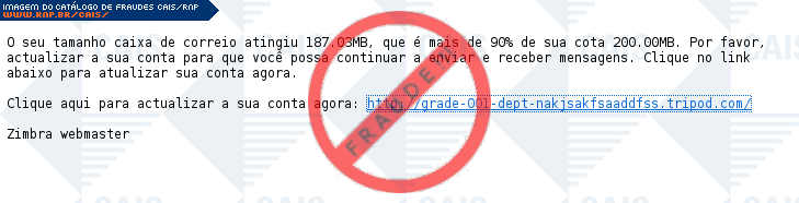 | comentário | O usuário recebe uma mensagem informando que a capacidade de armazenamento de sua conta de e-mail atingiu o limite sendo necessário uma atualização no link disponibilizado, entretanto a página é falsa criada para roubar os dados do e-mail da vítima. | |