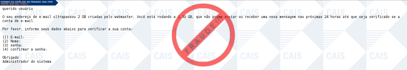 | comentário | O usuário recebe uma mensagem informando que a capacidade de armazenamento de sua conta de e-mail atingiu o limite sendo necessário responder o e-mail com algumas informações, no entanto o e-mail é falso criado para roubar os dados de login da vítima. | |