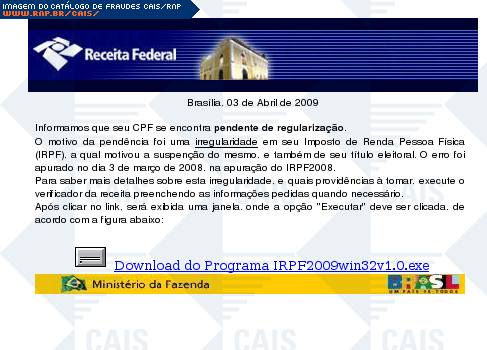 | comentário | Mensagem que usa o nome da Receita Federal para informar à vítima que seu cpf está pendente de regularização. Para mais informações, o usuário é induzido a baixar o arquivo malicioso IRPF2009win32v1.0.zip, que contém o Heur.Trojan.Generic (Kaspersky). | |