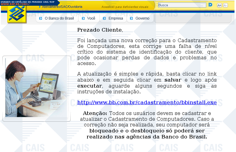 | comentário | Email falso se passando pelo Banco do Brasil comunicando a existência de correção para a ferramenta de cadastramento de computadores do sistema. Um link malicioso presente na mensagem, que deveria levar à correção, leva a um software malicioso identificado... (leia mais) | |