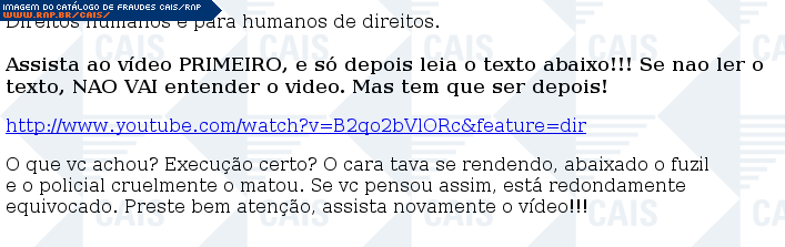 | comentário | Mensagem falando a respeito de vídeo de assassinato do YouTube, visando discutir se foi execução ou legítima defesa. O link para o vídeo leva a um software malicioso que não estava disponível no momento da análise. | |