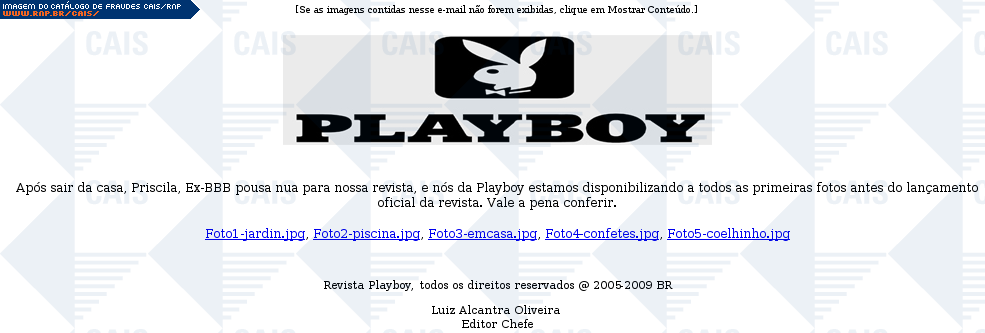 | comentário | Mensagem se passando pela Playboy a respeito de fotos da Priscila do BBB para a revista. A mensagem contém links para as supostas fotos, mas tais links levam a conteúdo malicioso que não estava disponível no momento da análise. | |