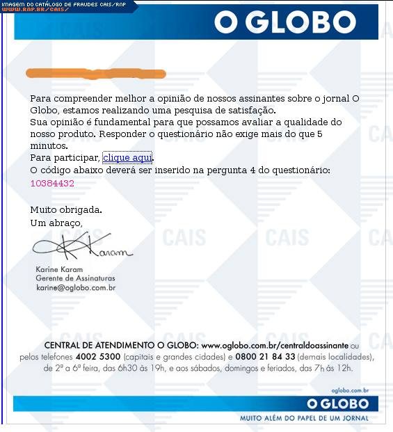 | comentário | E-mail supostamente do jornal O Globo, informando sobre a realização de uma pesquisa de satisfação, e necessitando da opinião do usuário. Não foi encontrado o arquivo malicioso na análise. | |