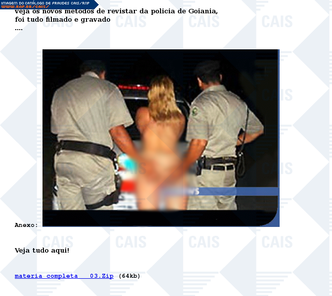 | comentário | Fraude que informa sobre um suposto vídeo de abuso sexual cometido pela polícia de Goiania. O e-mail contém um link para o arquivo malicioso identificado como Trojan-Dropper.Agent!IK. | |