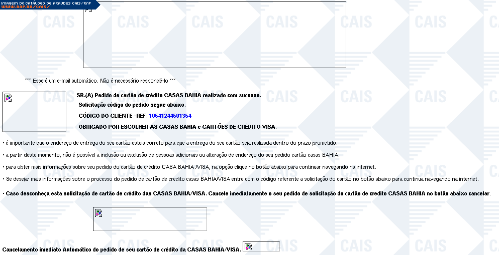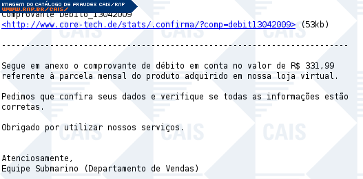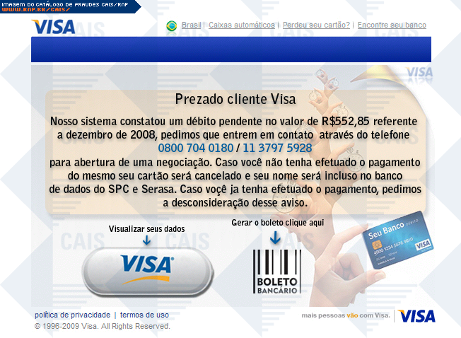 Esta página tem função informativa e educativa. Exibe uma coleção de imagens de phishing scam (fraudes eletrônicas) ou malware (código malicioso) veiculados por meio de spam (e-mail não-solicitado). Trata-se de conteúdo exemplificativo, não exaustivo, uma vez que não é possível contemplar todos os casos de fraudes existentes. Assim, caso você tenha conhecimento de um exemplar que não esteja aqui presente, isto não significa que não seja válido ou real. Inclusive incentivamos que você o envie para análise do CAIS para que, se for o caso, passe a integrar o nosso acervo.