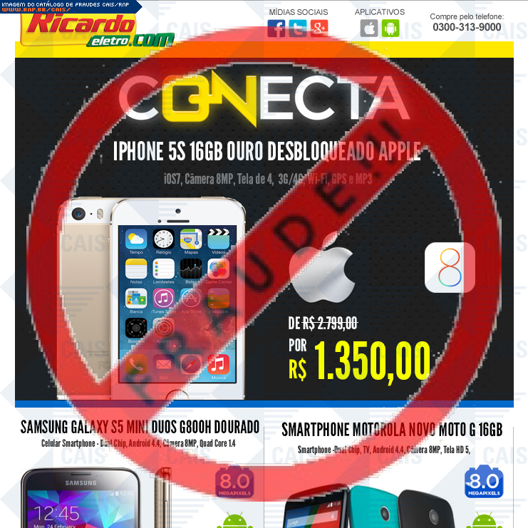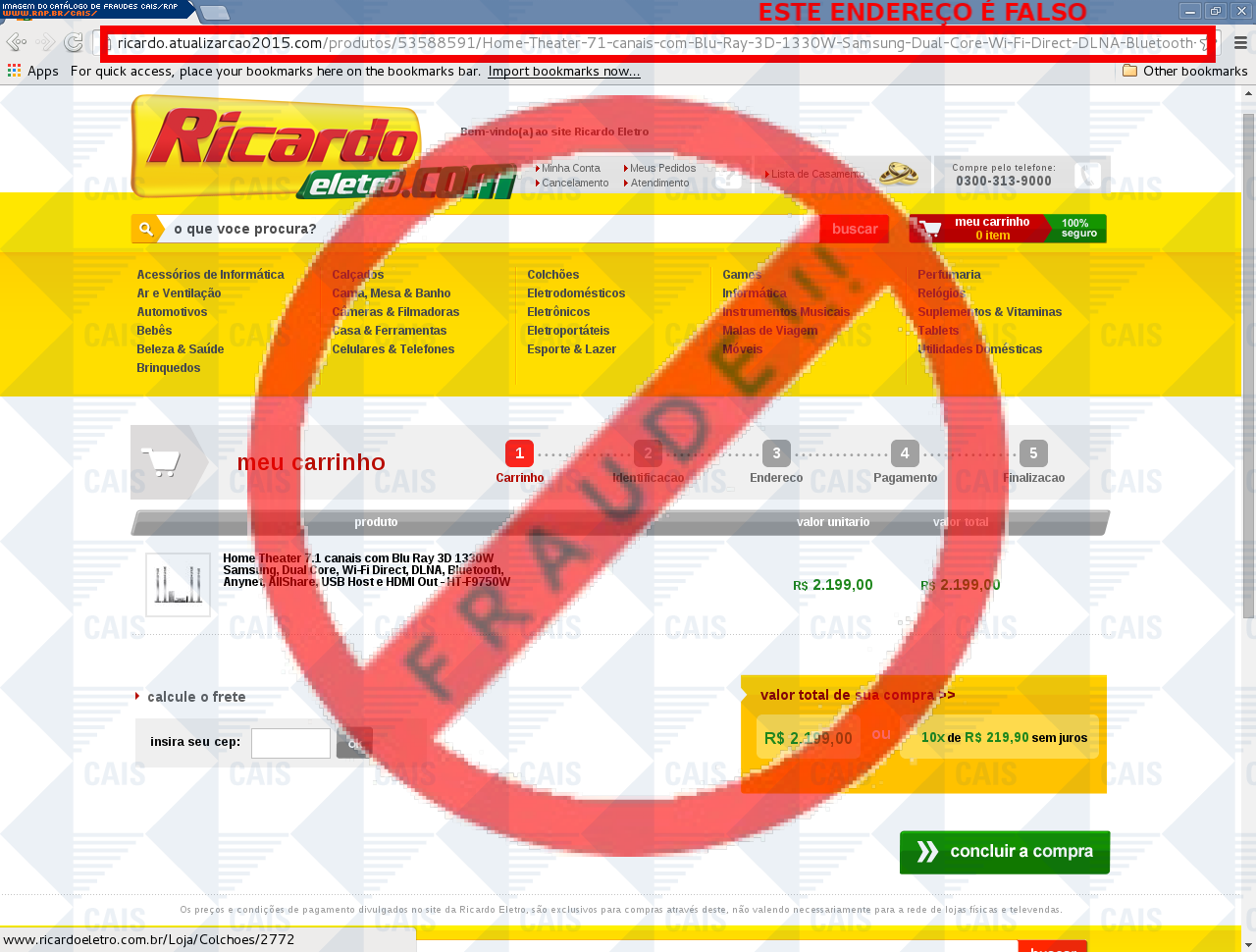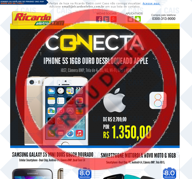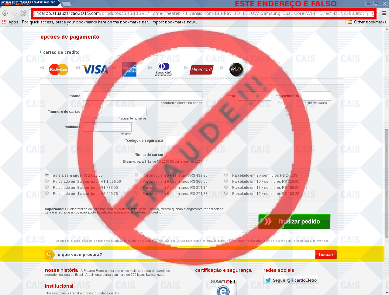 | comentário | A vítima recebe um e-mail informando sobre promoções no site de compra da Ricardo Eletro disponibilizando link de vários produtos em desconto, no entanto a página é falsa destinada a roubar as informações pessoais e do cartão do usuário. | |
