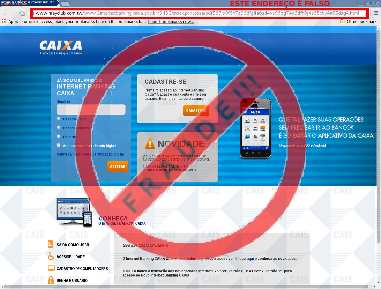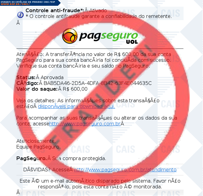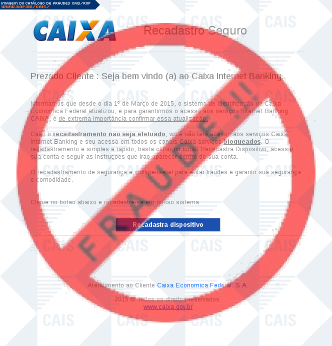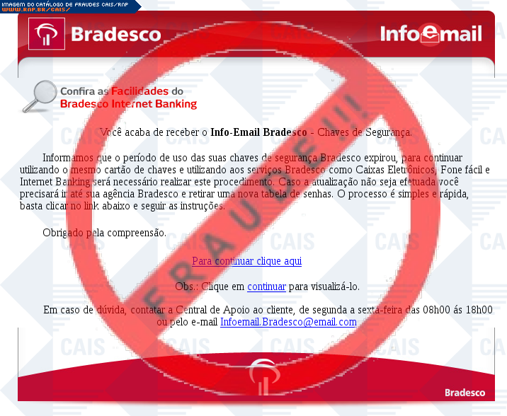 Esta página tem função informativa e educativa. Exibe uma coleção de imagens de phishing scam (fraudes eletrônicas) ou malware (código malicioso) veiculados por meio de spam (e-mail não-solicitado). Trata-se de conteúdo exemplificativo, não exaustivo, uma vez que não é possível contemplar todos os casos de fraudes existentes. Assim, caso você tenha conhecimento de um exemplar que não esteja aqui presente, isto não significa que não seja válido ou real. Inclusive incentivamos que você o envie para análise do CAIS para que, se for o caso, passe a integrar o nosso acervo.