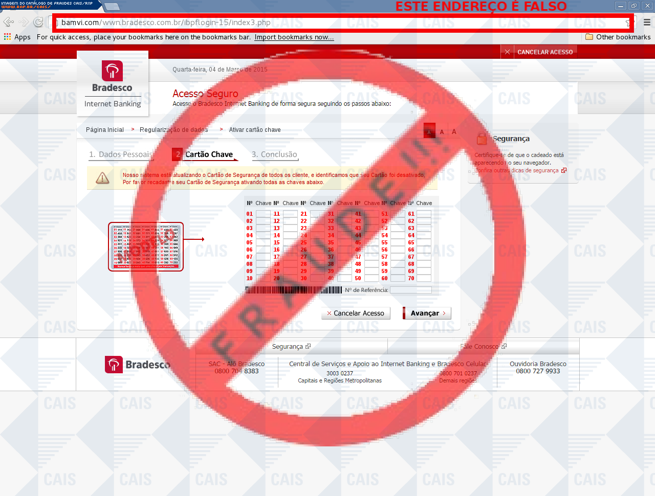 | comentário | O usuário recebe um e-mail informando que o tempo de uso de sua chave de segurança da conta do banco Bradesco expirou sendo necessário realizar uma atualização no link disponibilizado, entretanto a página fornecida é falsa criada para roubar os dados bancários... (leia mais) | |