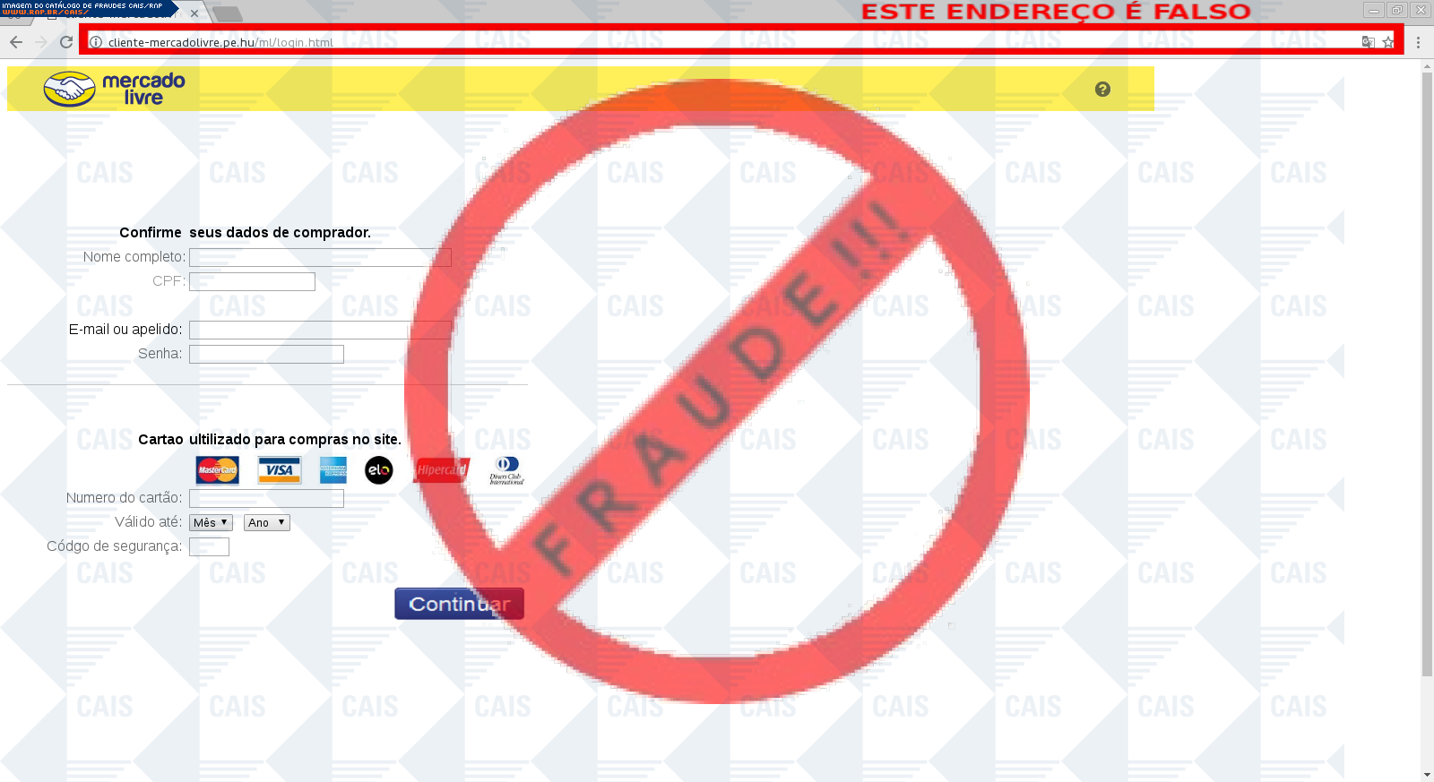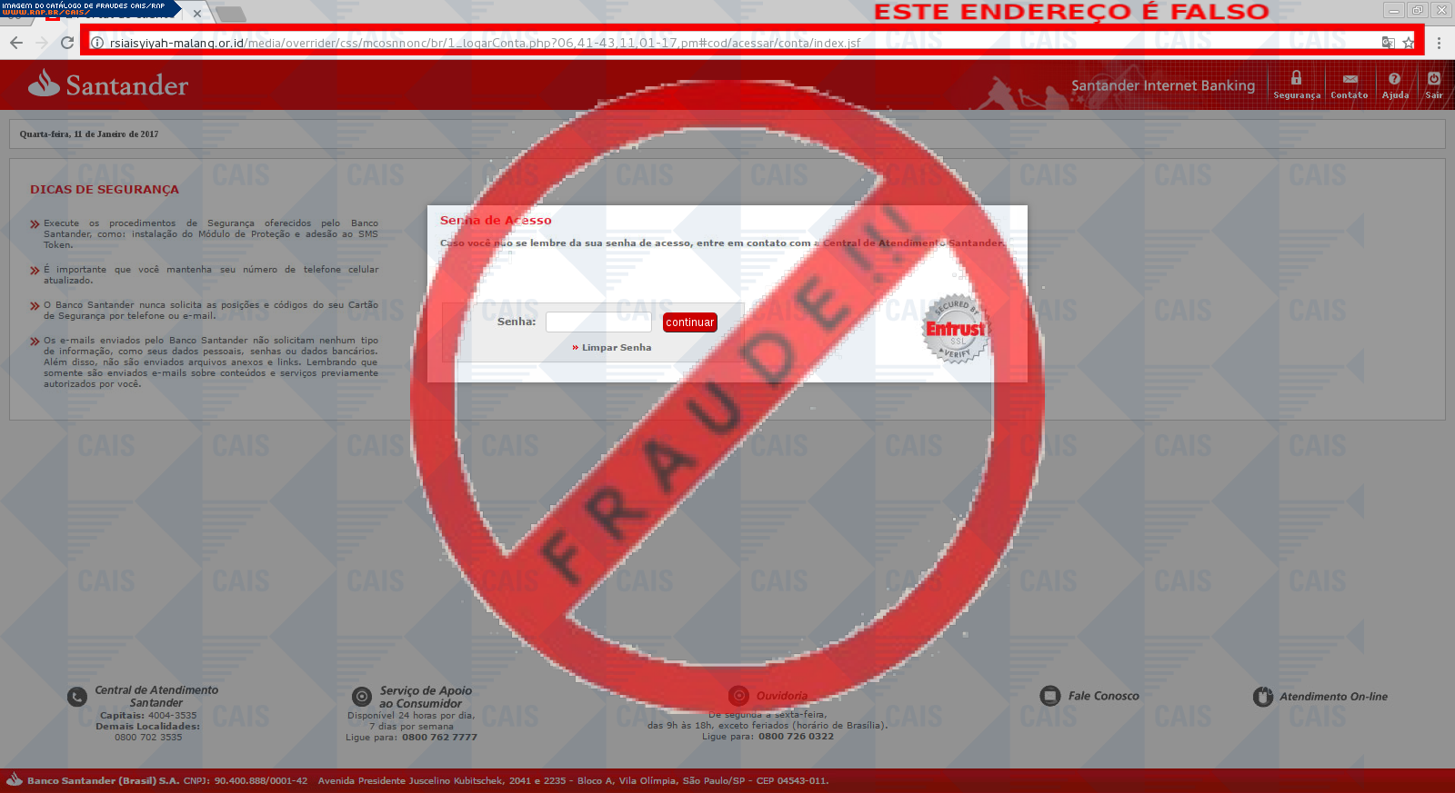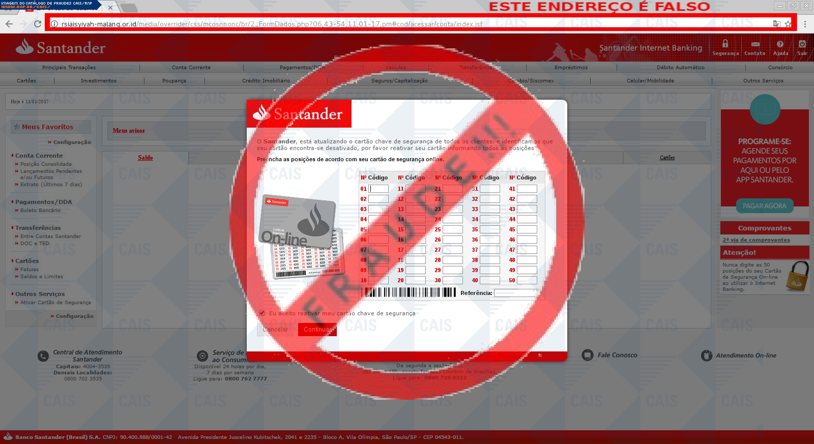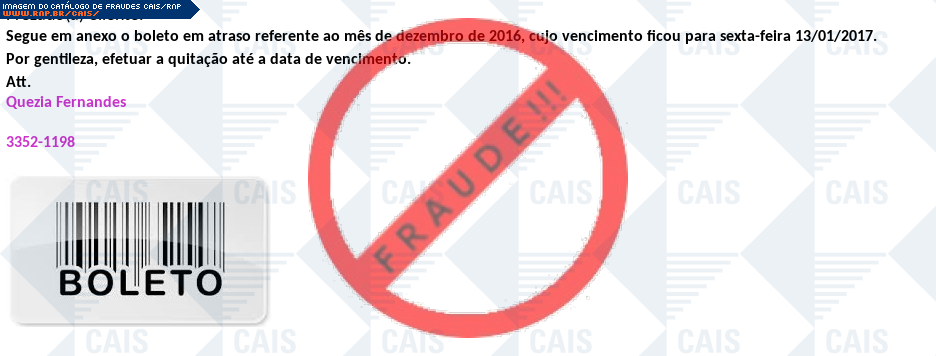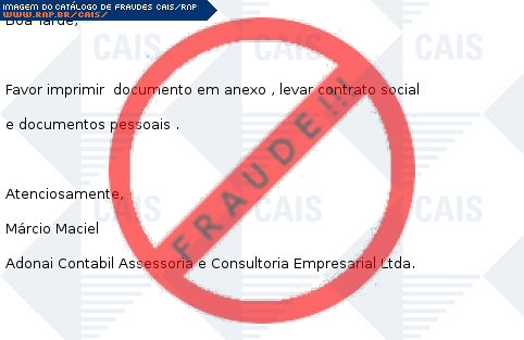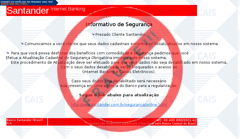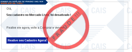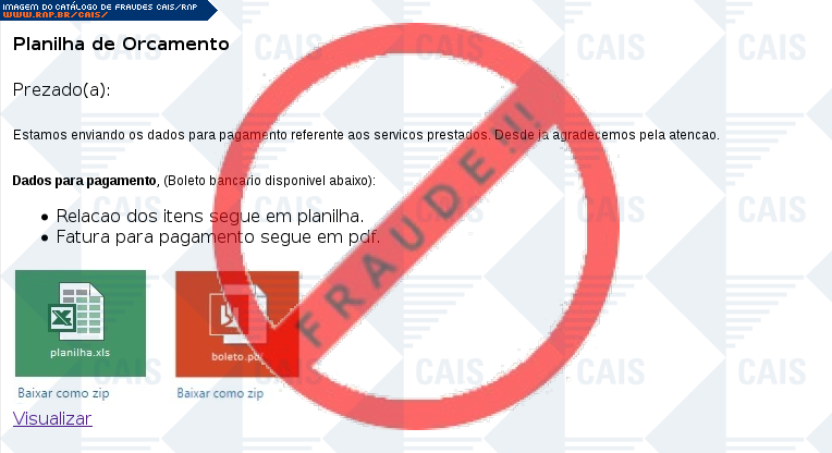 Esta página tem função informativa e educativa. Exibe uma coleção de imagens de phishing scam (fraudes eletrônicas) ou malware (código malicioso) veiculados por meio de spam (e-mail não-solicitado). Trata-se de conteúdo exemplificativo, não exaustivo, uma vez que não é possível contemplar todos os casos de fraudes existentes. Assim, caso você tenha conhecimento de um exemplar que não esteja aqui presente, isto não significa que não seja válido ou real. Inclusive incentivamos que você o envie para análise do CAIS para que, se for o caso, passe a integrar o nosso acervo.