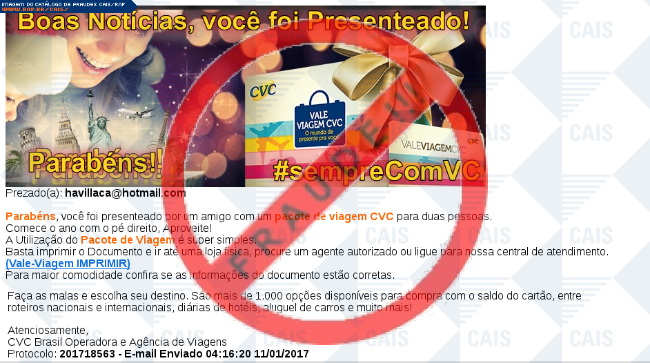 | assunto | Parabéns, você foi presenteado com um VALE-VIAGEM CVC. (Entre em contato conosco Urgente) | |
