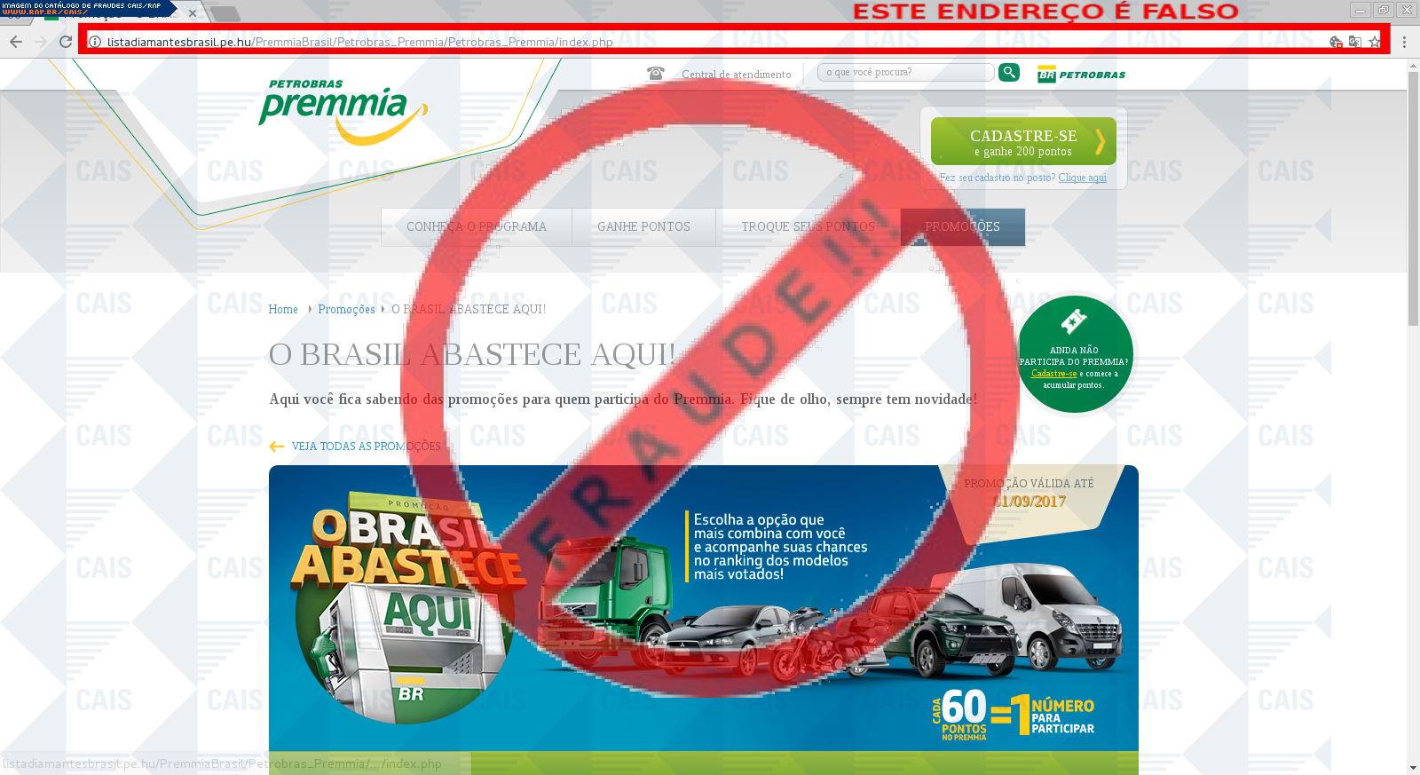| comentário | A vítima recebe um e-mail informando sobre as vantagens da promoção Petrobras Premia, sendo o cadastro através do link disponibilizado, no entanto a página é falsa criada para roubar informações do usuário. | |