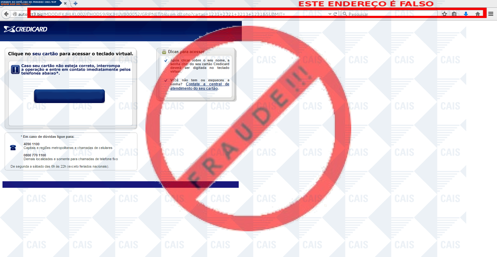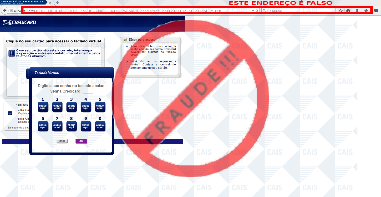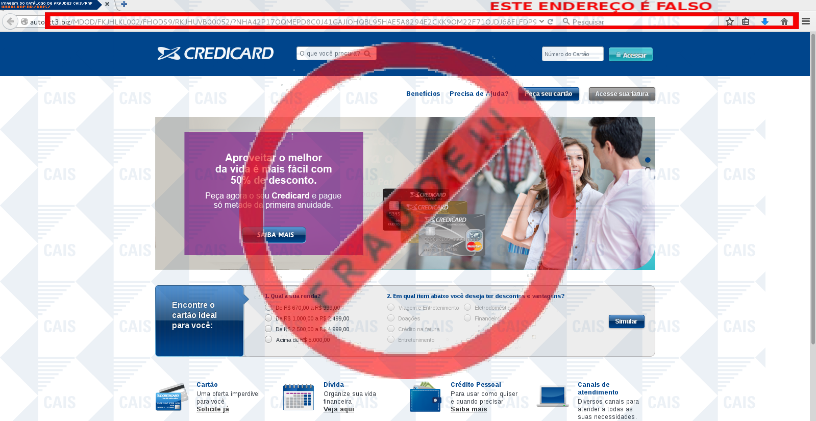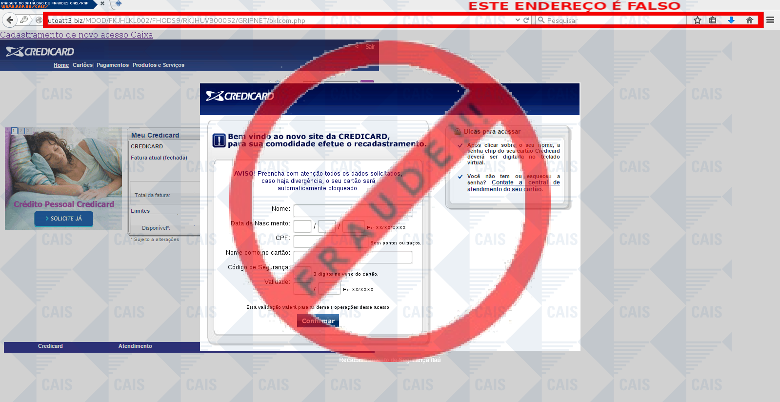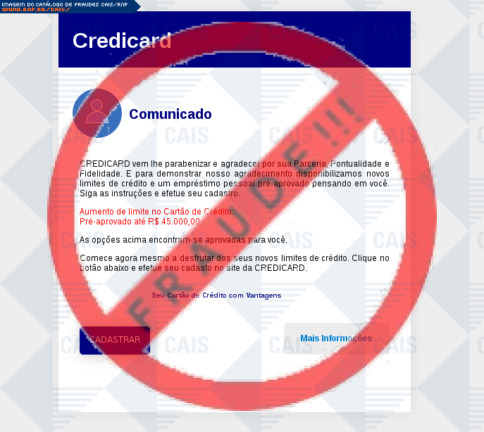 | comentário | A vítima recebe um email oferecendo aumento de limite em seu cartão de crédito, mediante um cadastro no site da Credicard. Entretanto, o link para cadastro leva a um site falso que tenta roubar informações de cartão de crédito da vítima. | |