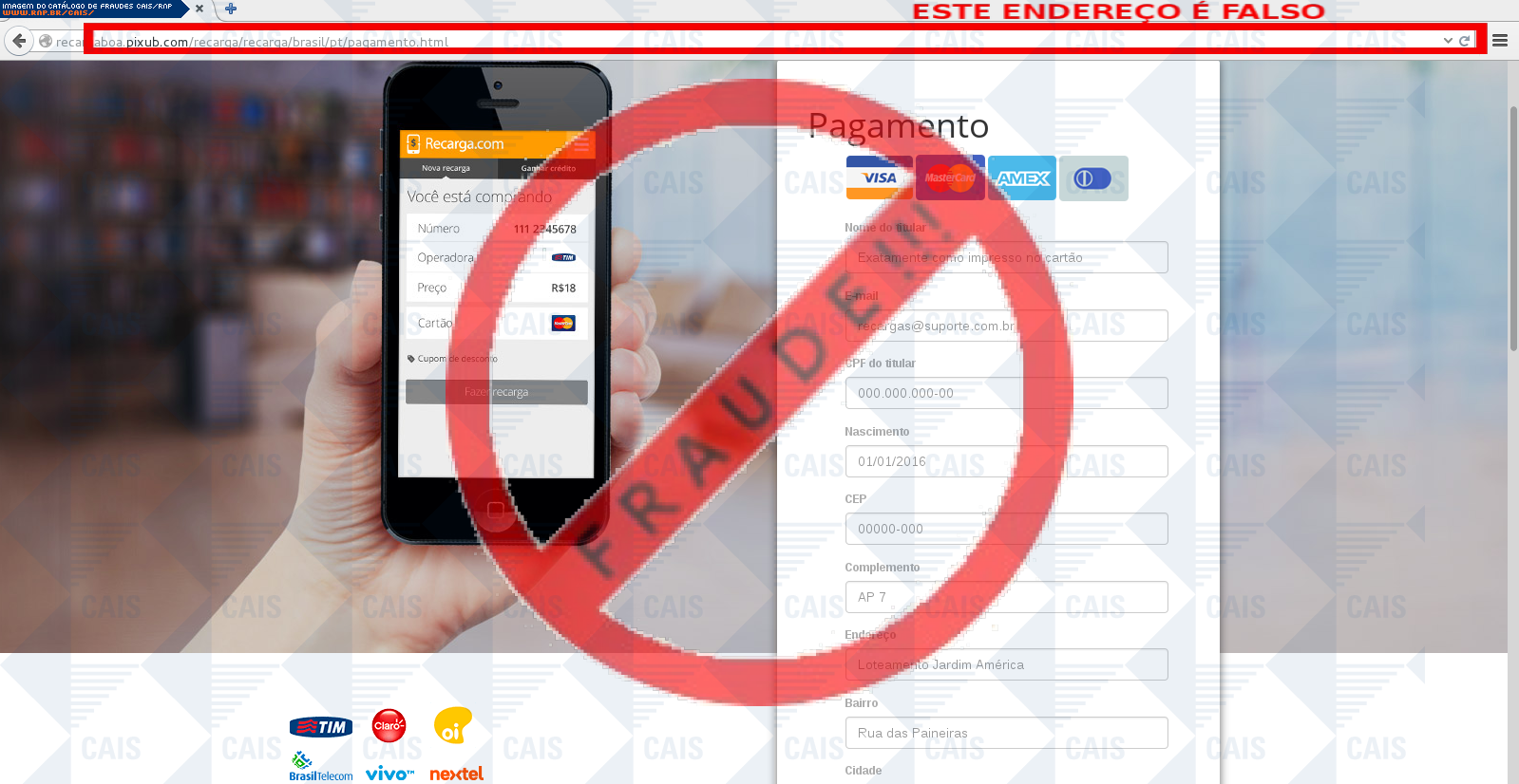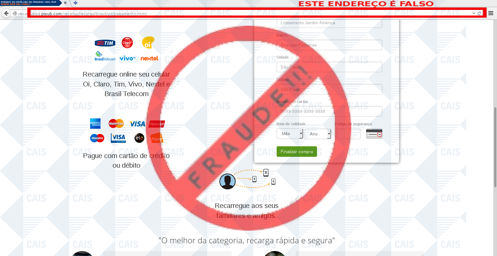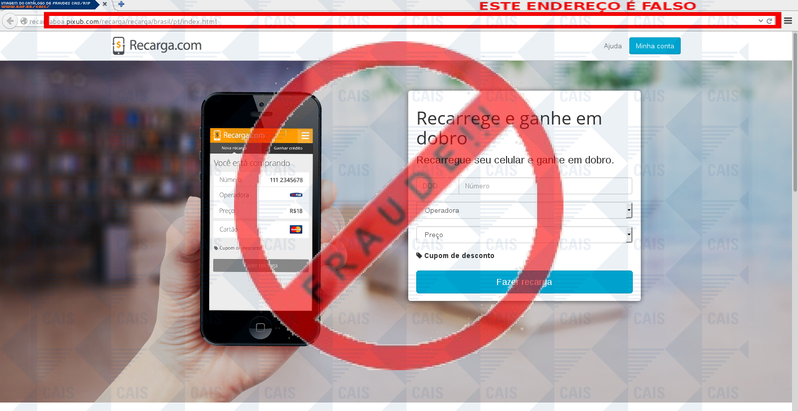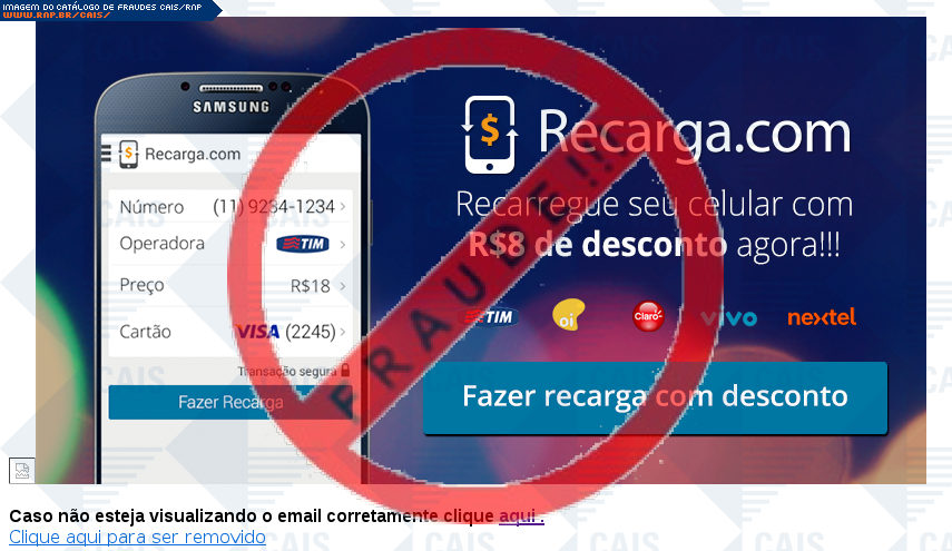 | comentário | A vítima recebe um email anunciando um site de recarga de celular em dobro. Entretanto, o link na mensagem leva a um site que tenta roubar informações de cartão de crédito da vítima. | |