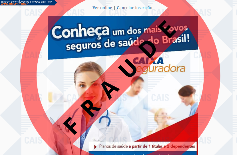Esta página tem função informativa e educativa. Exibe uma coleção de imagens de phishing scam (fraudes eletrônicas) ou malware (código malicioso) veiculados por meio de spam (e-mail não-solicitado). Trata-se de conteúdo exemplificativo, não exaustivo, uma vez que não é possível contemplar todos os casos de fraudes existentes. Assim, caso você tenha conhecimento de um exemplar que não esteja aqui presente, isto não significa que não seja válido ou real. Inclusive incentivamos que você o envie para análise do CAIS para que, se for o caso, passe a integrar o nosso acervo.