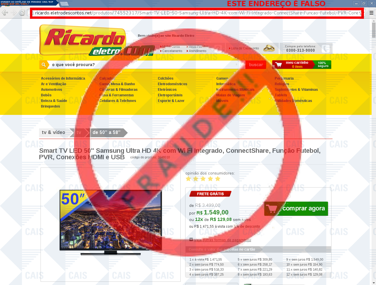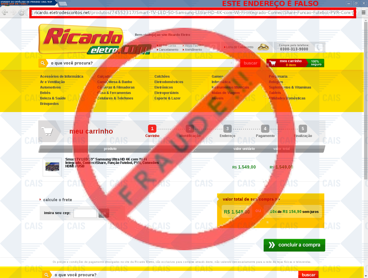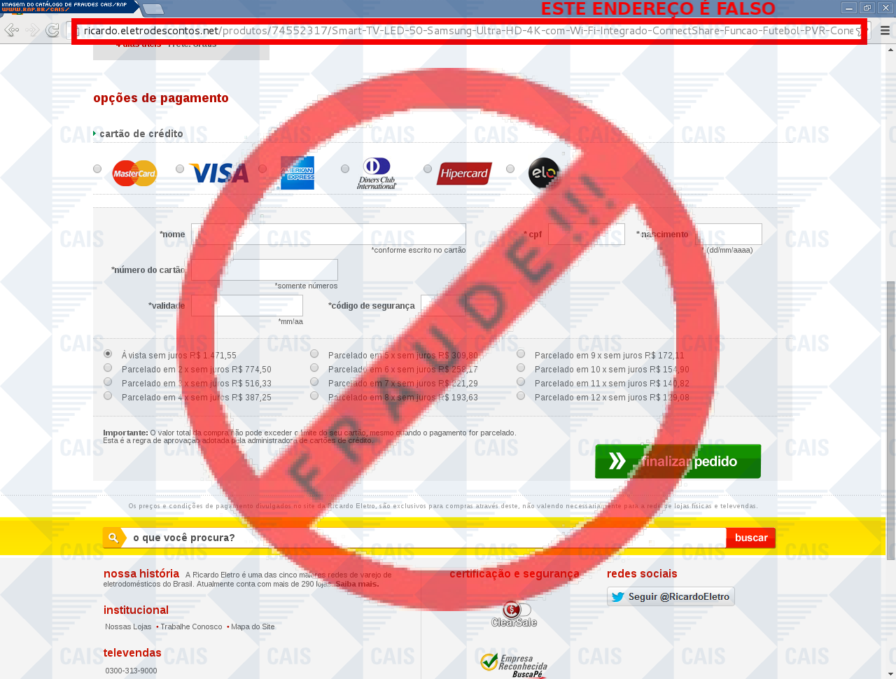 | comentário | A vítima recebe um e-mail informando sobre promoções no site de compra da Ricardo Eletro disponibilizando link de vários produtos em desconto, no entanto a página é falsa destinada a roubar as informações pessoais e do cartão do usuário. | |