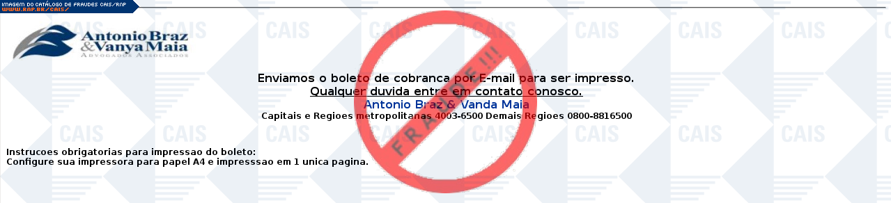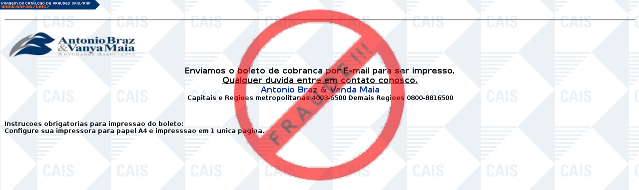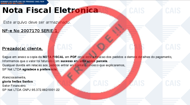 Esta página tem função informativa e educativa. Exibe uma coleção de imagens de phishing scam (fraudes eletrônicas) ou malware (código malicioso) veiculados por meio de spam (e-mail não-solicitado). Trata-se de conteúdo exemplificativo, não exaustivo, uma vez que não é possível contemplar todos os casos de fraudes existentes. Assim, caso você tenha conhecimento de um exemplar que não esteja aqui presente, isto não significa que não seja válido ou real. Inclusive incentivamos que você o envie para análise do CAIS para que, se for o caso, passe a integrar o nosso acervo.
