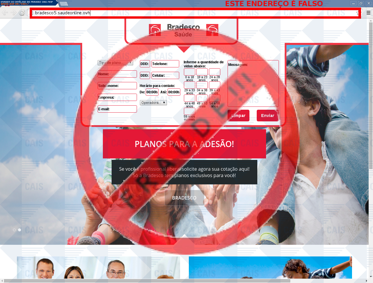| comentário | A vítima recebe uma mensagem sobre o plano de saúde do banco Bradesco com o link para consulta e informações disponíveis no link indicado, no entanto a página é falsa criada para capturar algumas informações da vítima. | |