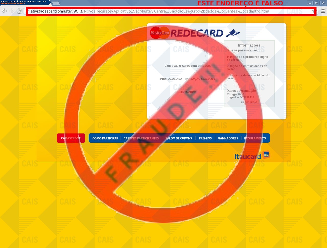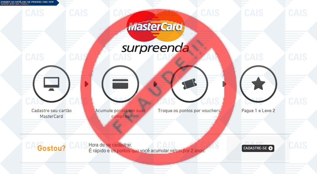 | comentário | A vítima recebe um e-mail informando sobre os benefícios do programa de Surpreenda do cartão MasterCard disponibilizando o link para cadastro, no entanto a página é falsa criada para roubar as informações do cartão da vítima. | |