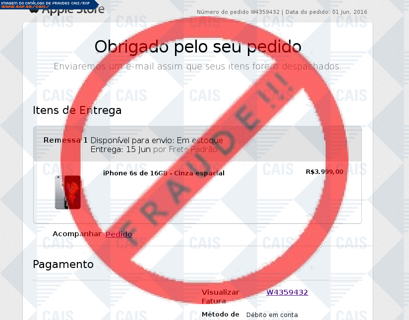 Esta página tem função informativa e educativa. Exibe uma coleção de imagens de phishing scam (fraudes eletrônicas) ou malware (código malicioso) veiculados por meio de spam (e-mail não-solicitado). Trata-se de conteúdo exemplificativo, não exaustivo, uma vez que não é possível contemplar todos os casos de fraudes existentes. Assim, caso você tenha conhecimento de um exemplar que não esteja aqui presente, isto não significa que não seja válido ou real. Inclusive incentivamos que você o envie para análise do CAIS para que, se for o caso, passe a integrar o nosso acervo.