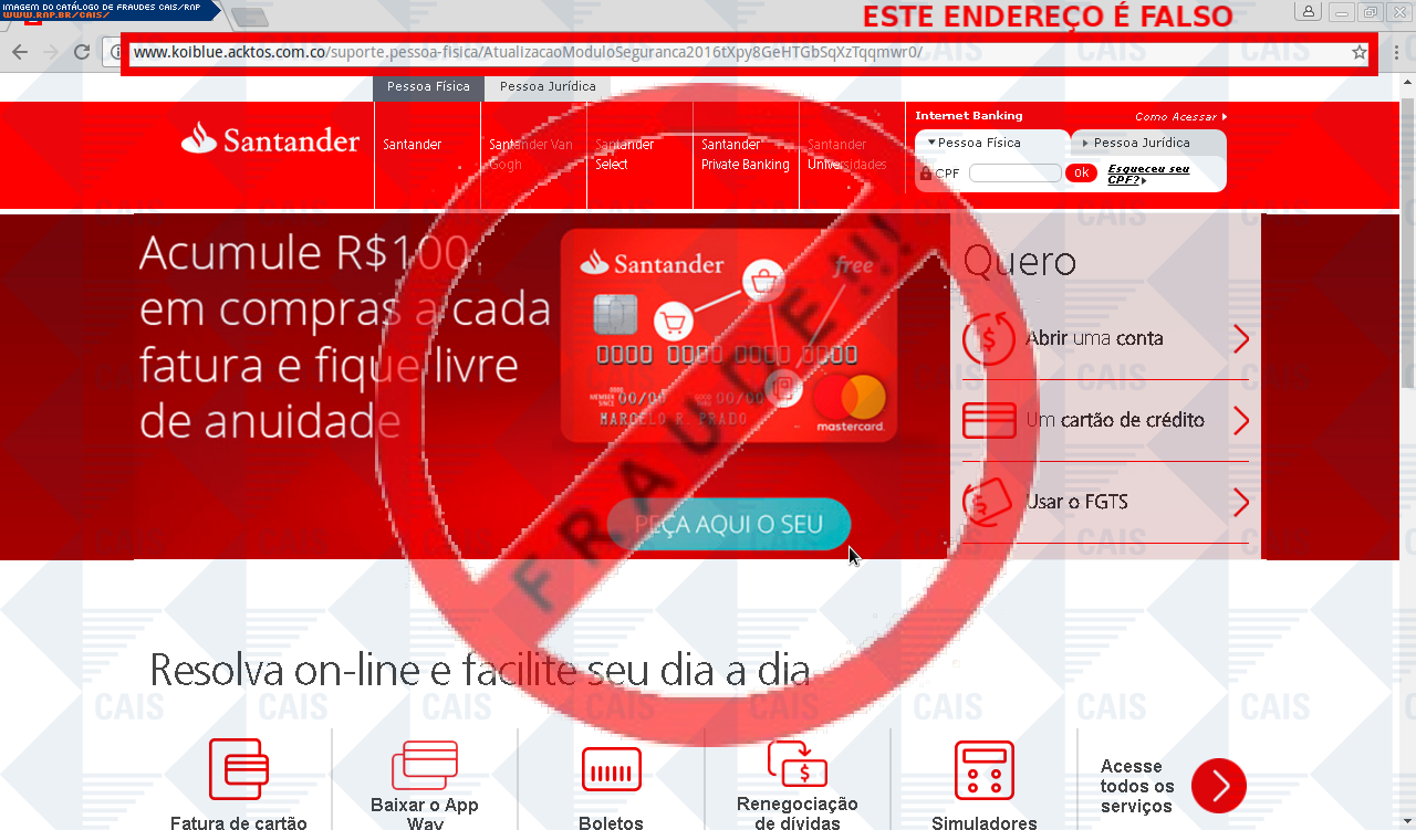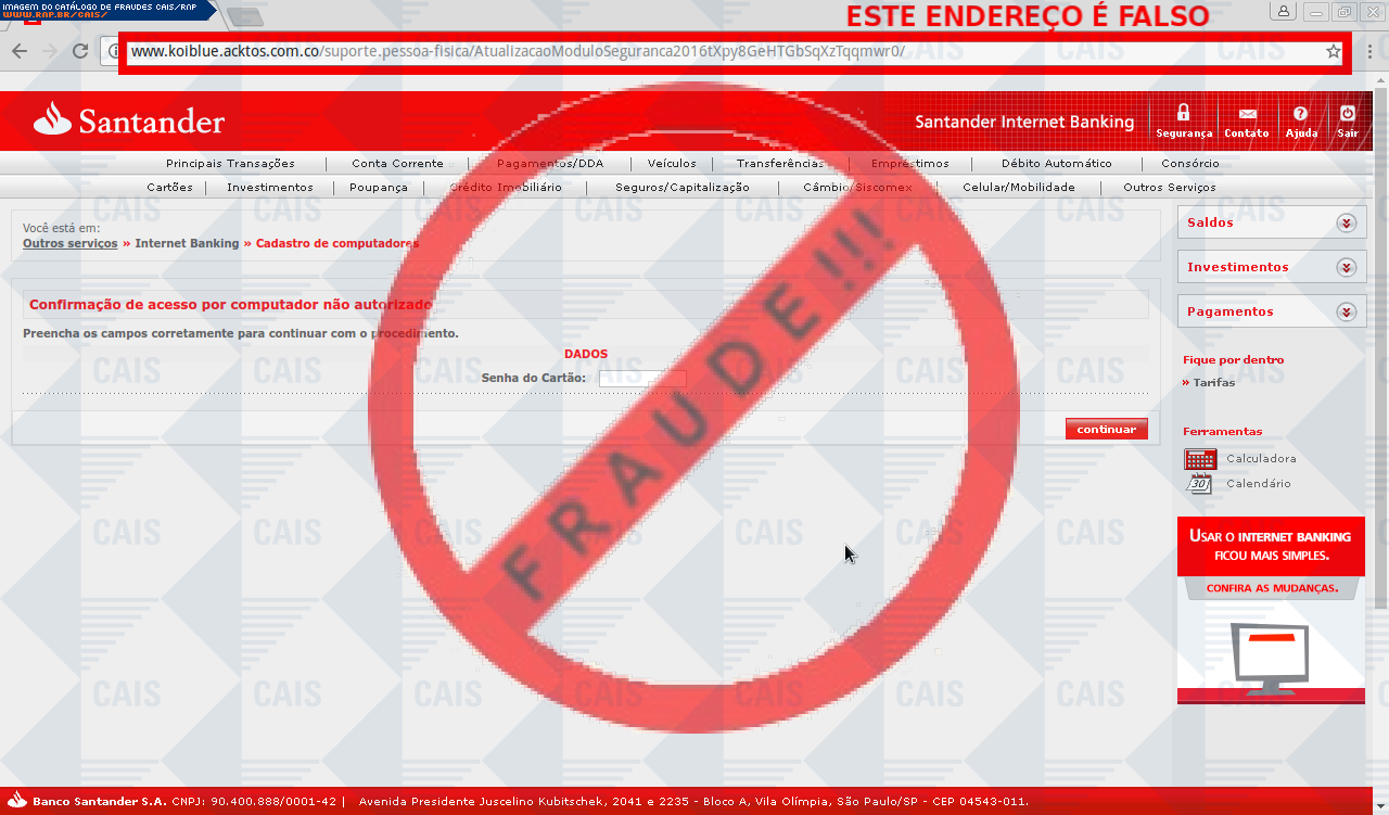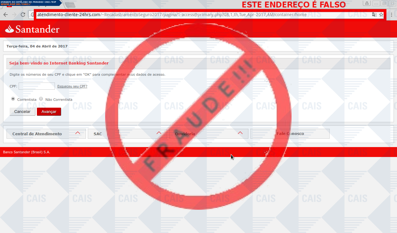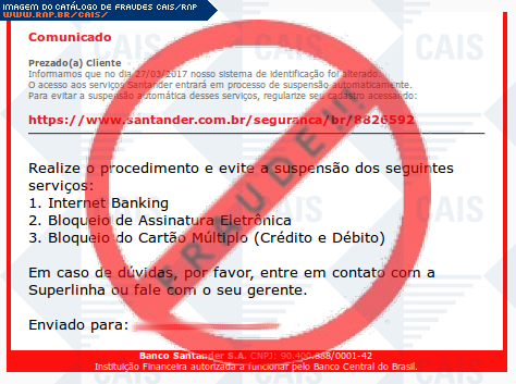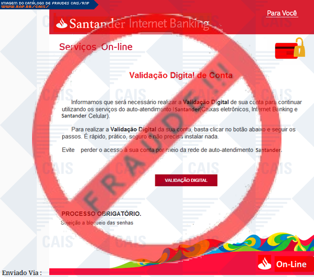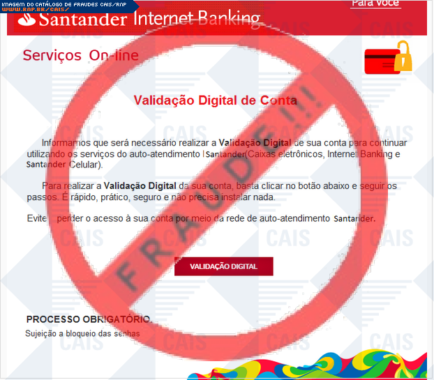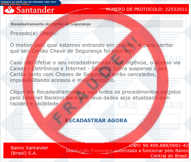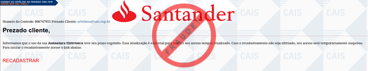 Esta página tem função informativa e educativa. Exibe uma coleção de imagens de phishing scam (fraudes eletrônicas) ou malware (código malicioso) veiculados por meio de spam (e-mail não-solicitado). Trata-se de conteúdo exemplificativo, não exaustivo, uma vez que não é possível contemplar todos os casos de fraudes existentes. Assim, caso você tenha conhecimento de um exemplar que não esteja aqui presente, isto não significa que não seja válido ou real. Inclusive incentivamos que você o envie para análise do CAIS para que, se for o caso, passe a integrar o nosso acervo.