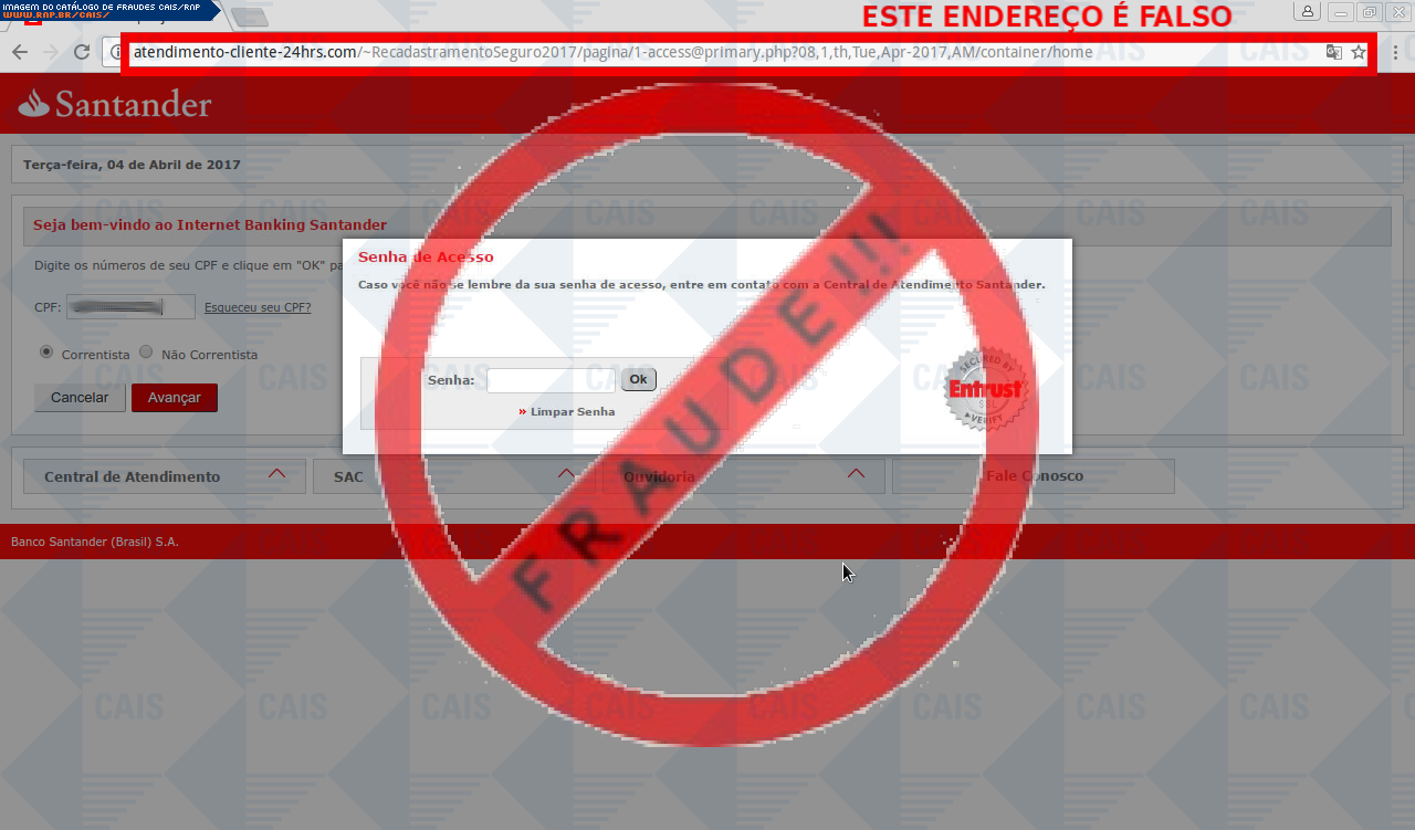 | comentário | A vitima recebe uma mensagem informando que o certificado de segurança do dispositivo do Banco Santander está desatualizado, sendo necessário realizar uma atualização no link disponível, entretanto a página é falsa criada para roubar os dados bancários do... (leia mais) | |