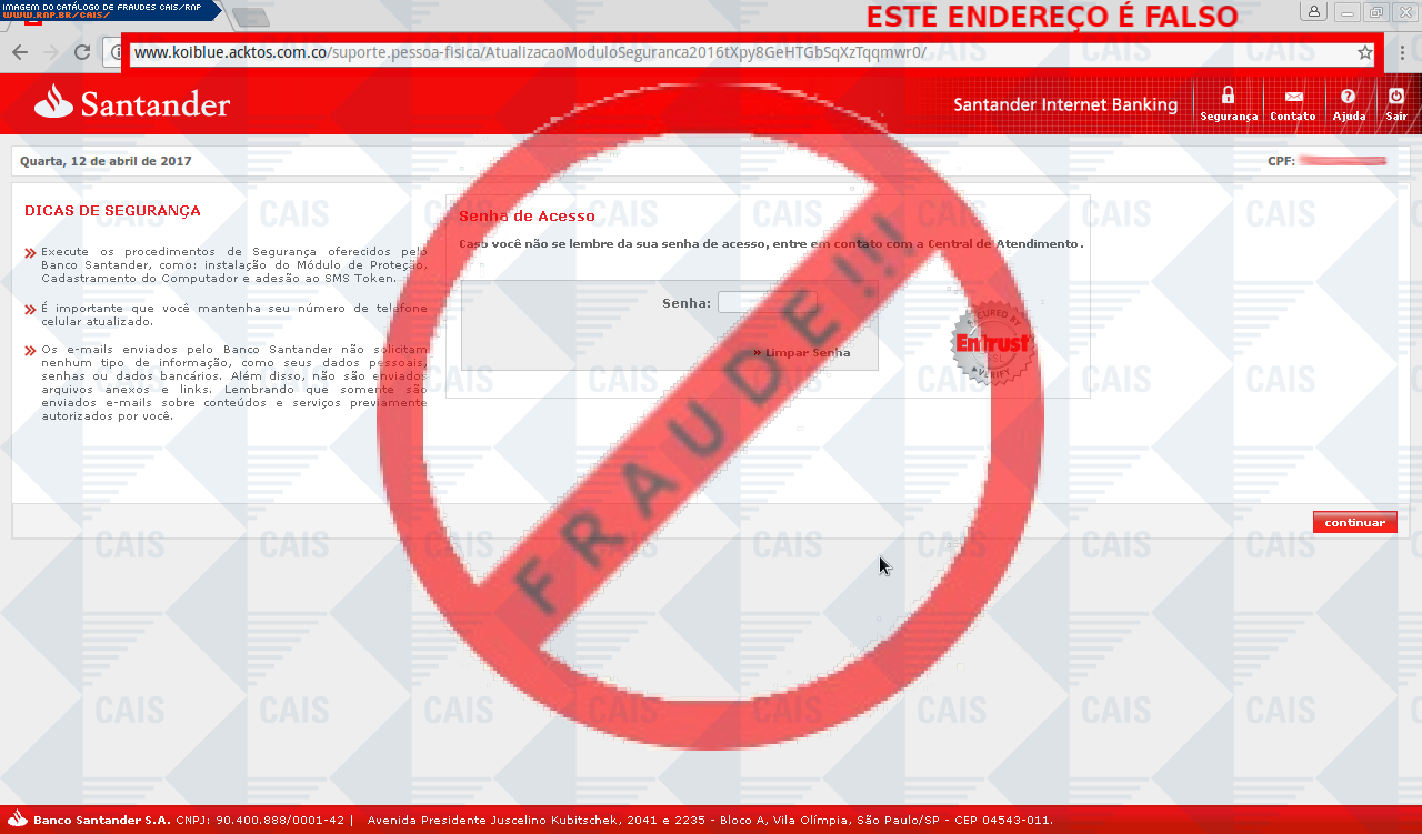 | comentário | O usuário recebe uma mensagem informando que o sistema do banco Santander atualizou sendo necessário realizar uma atualização também na sua conta, no entanto a página é falsa destinada a roubar as informações bancárias do usuário. | |