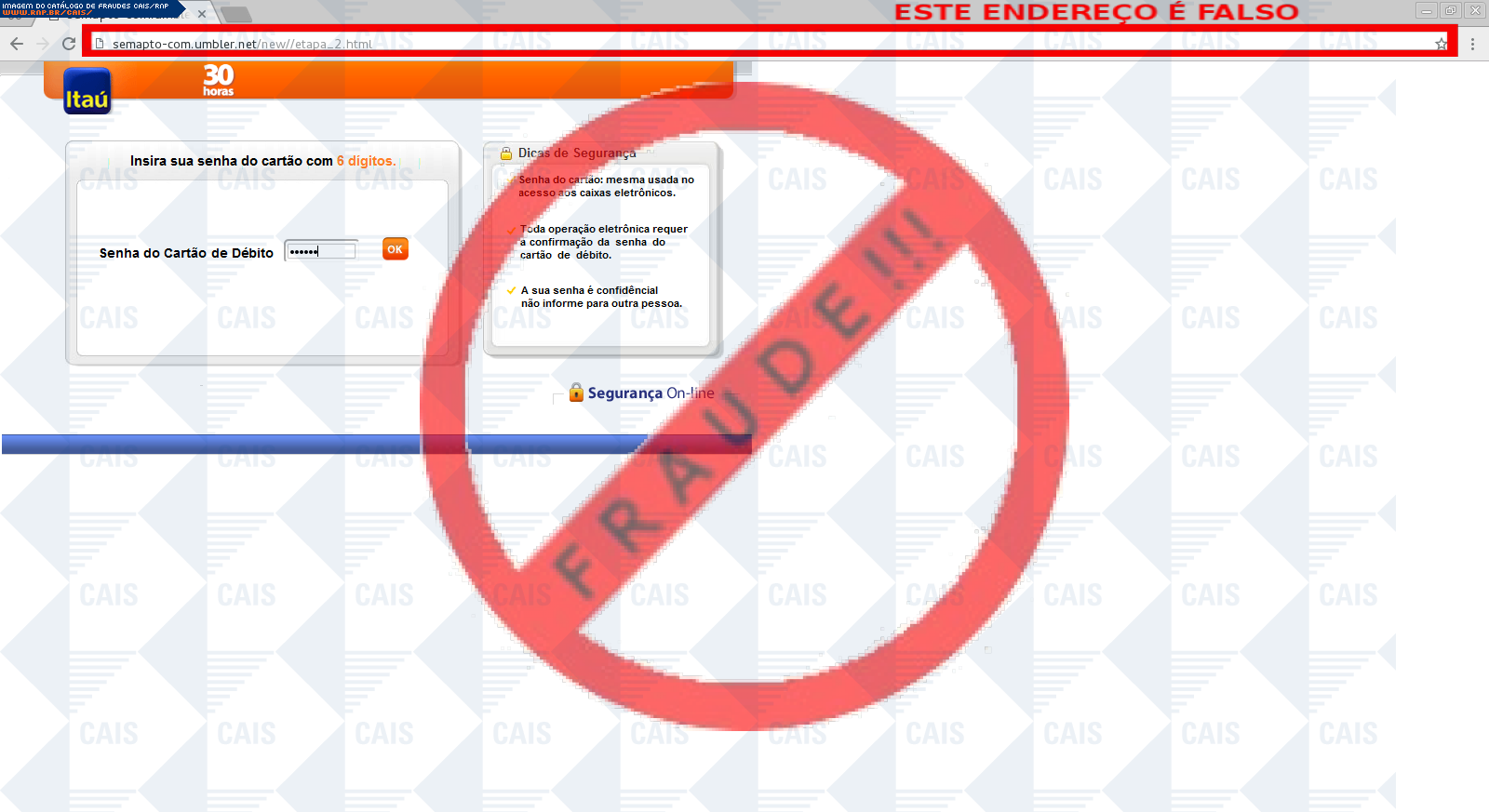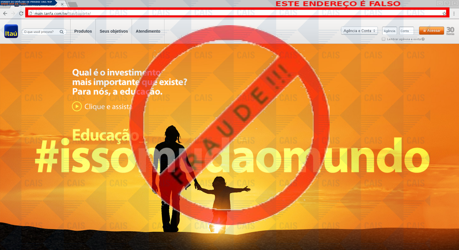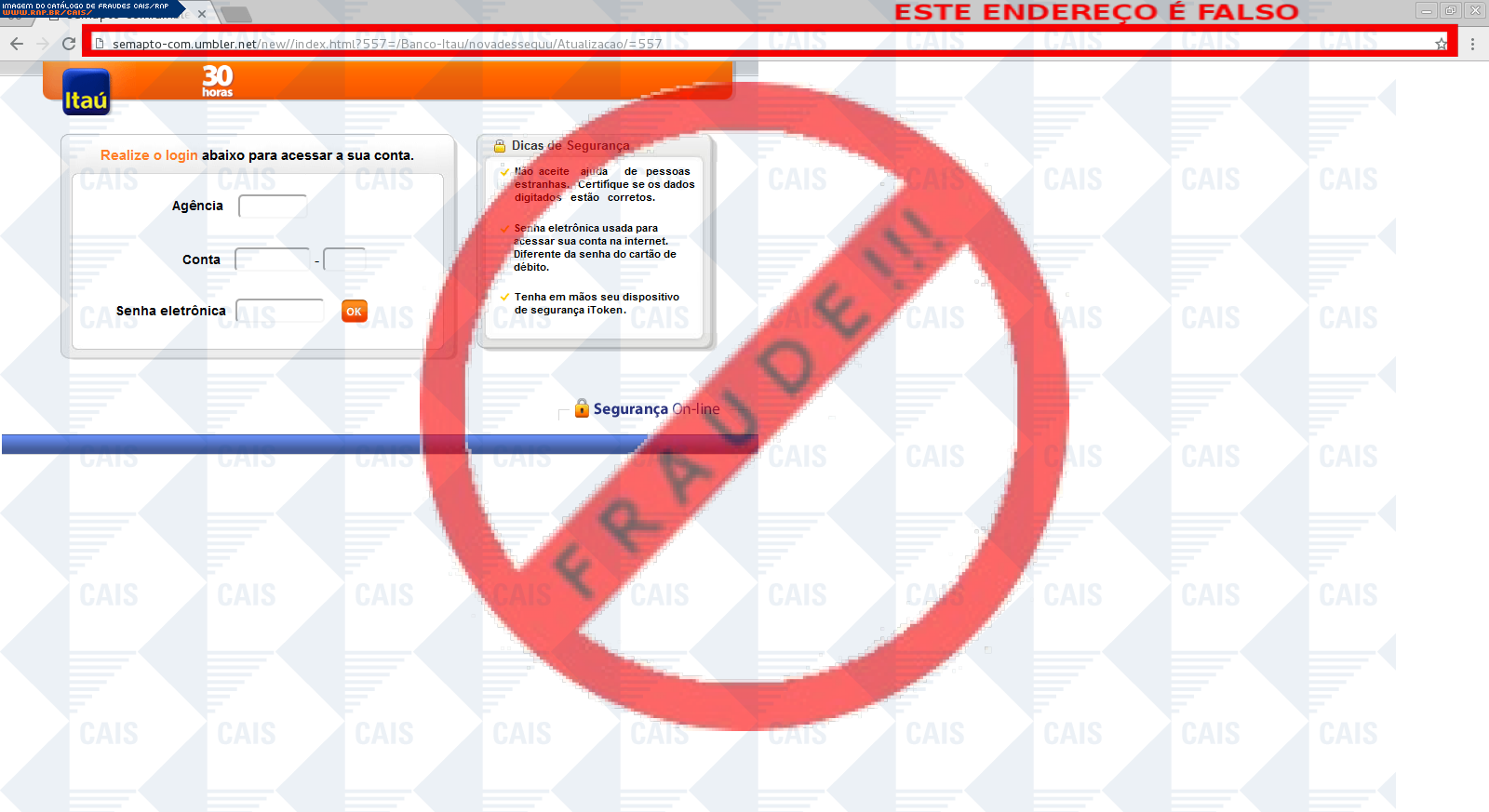 | comentário | O usuário recebe uma mensagem informando que o sistema do banco Itau foi atualizado sendo necessário realizar uma atualização também na sua conta, no entanto a página é falsa destinada a roubar as informações bancárias do usuário. | |
