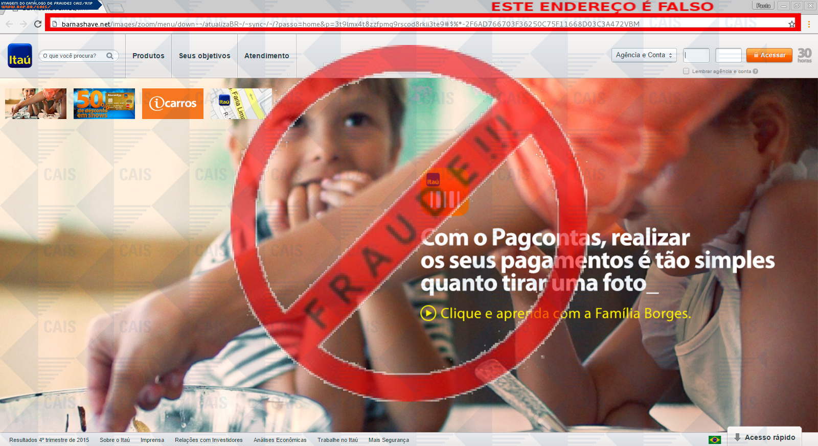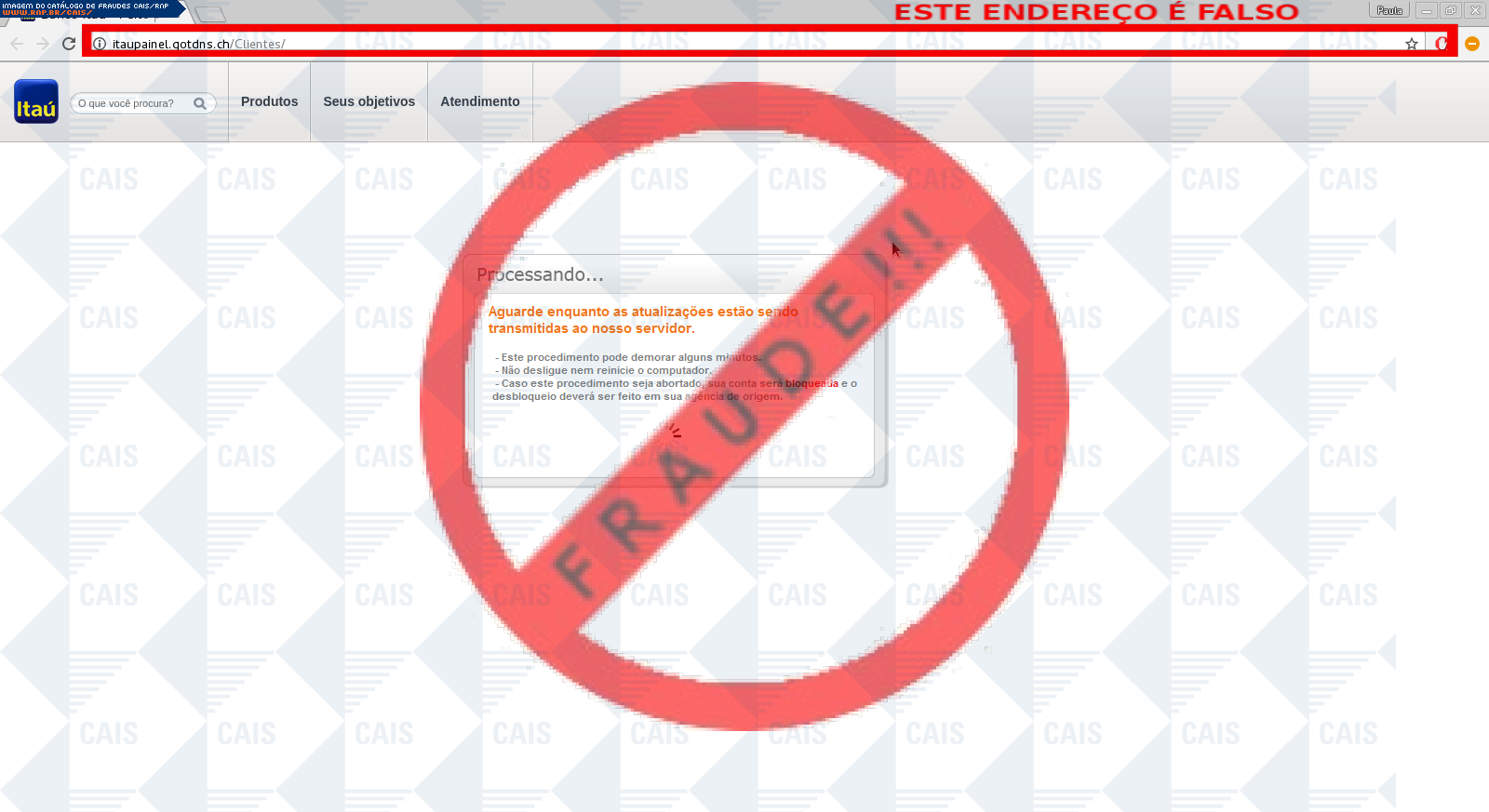 | comentário | O usuário recebe uma mensagem informando que o sistema do banco Itau atualizou sendo necessário realizar uma atualização também na sua conta, no entanto a página é falsa destinada a roubar as informações bancárias do usuário. | |