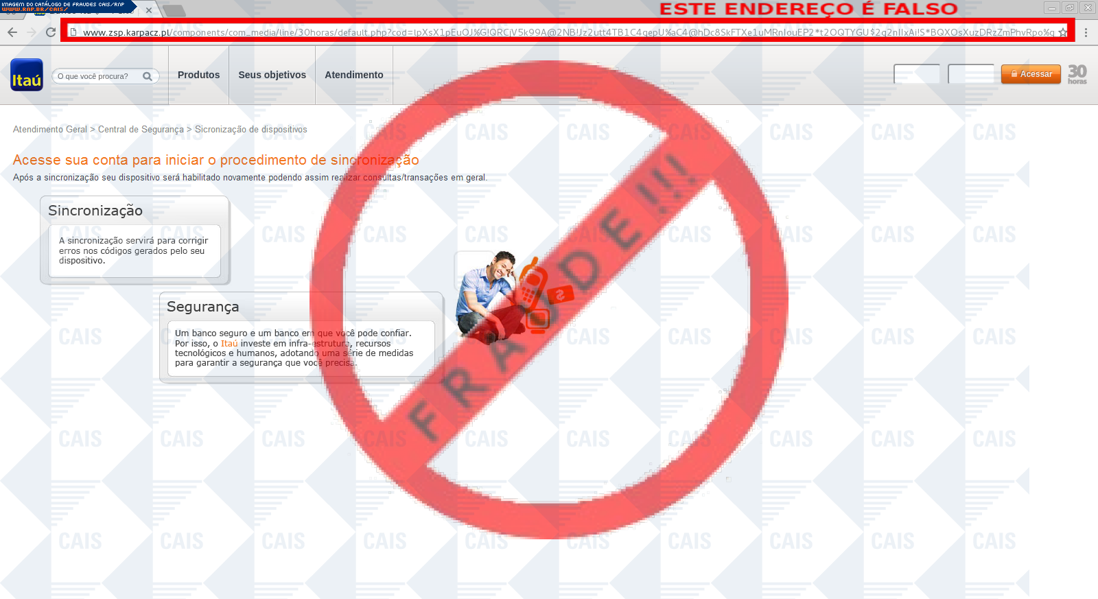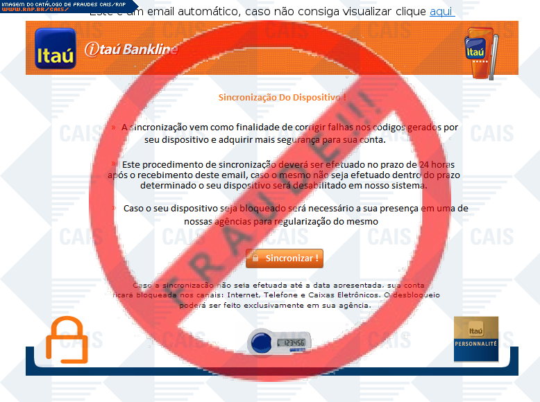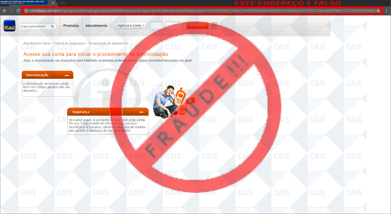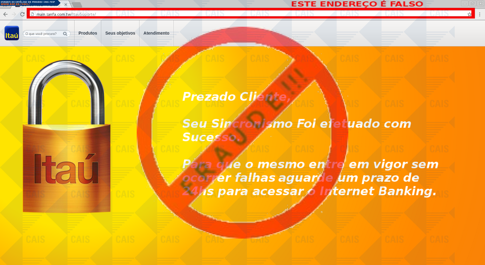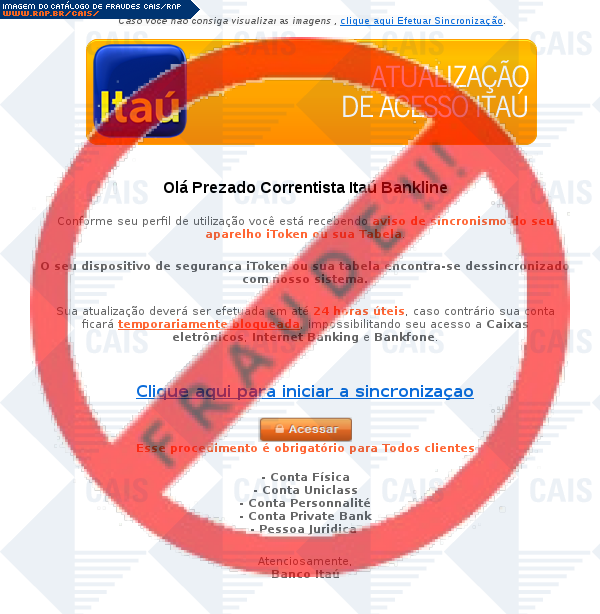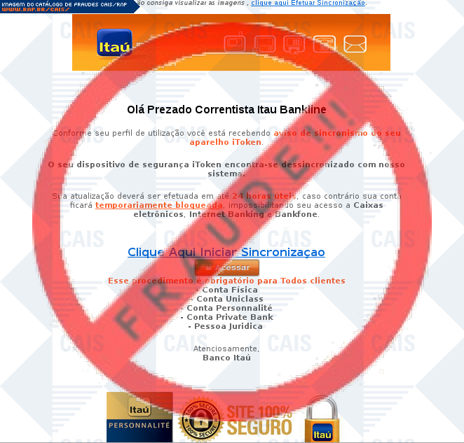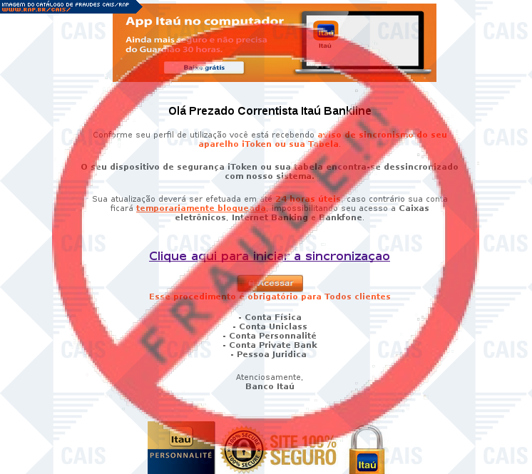 | comentário | A vítima recebe uma mensagem informando que seu aparelho itoken referente a uma conta no banco Itaú não está sincronizado sendo necessário realizar a sincronização no link disponível, entretanto a página é falsa criada para roubar os dados bancários do usuário.... (leia mais) | |