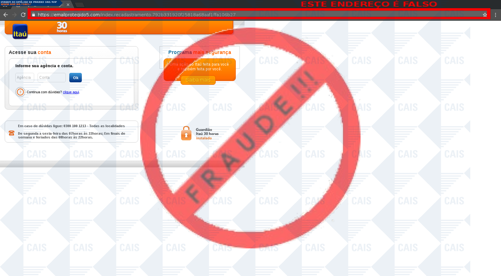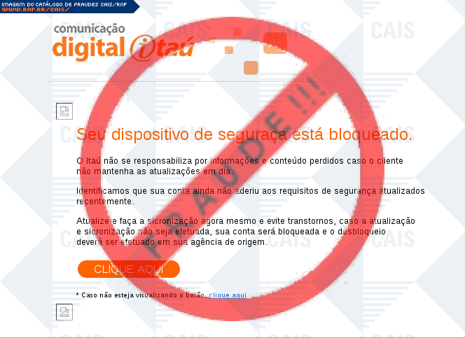Esta página tem função informativa e educativa. Exibe uma coleção de imagens de phishing scam (fraudes eletrônicas) ou malware (código malicioso) veiculados por meio de spam (e-mail não-solicitado). Trata-se de conteúdo exemplificativo, não exaustivo, uma vez que não é possível contemplar todos os casos de fraudes existentes. Assim, caso você tenha conhecimento de um exemplar que não esteja aqui presente, isto não significa que não seja válido ou real. Inclusive incentivamos que você o envie para análise do CAIS para que, se for o caso, passe a integrar o nosso acervo.